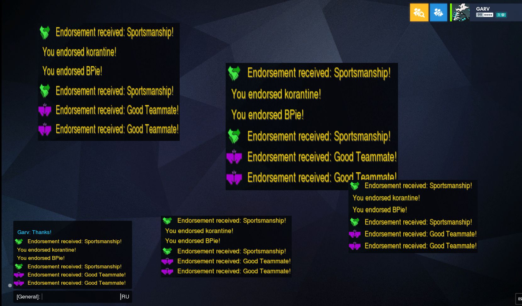 Я не репорчу за нестандартные пики, если ты полезен. Саппорты, которые были втором и третьем слоте (я мерсимейн) получают "гуд тиммейт" эндорс. Танки, которые хорошо прикрывали меня или перевернули ключевой файт, получают "шот коллер" эндорс. Дебилоиды на ДПС не получают эндорс никогда. Если ты был сильным игроком в противоположной команде, но тиммейты тебе заруинили, и при этом у меня есть лишний эндорс, то я даю тебе "спортсменшип". Если мы проиграли, то эндорс не получает никто!