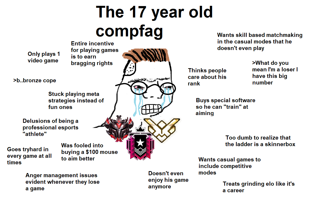 >>49983894 На стадионе нет мм. Все эти лиги - тупо фикция, по факту же к тебе в про ранк кидают рандомов-мимокроков с брынзы, рукожопых ливеров, или, что ещё хуже, долбоёбов с билдами от протыков, и таких каток 80%, так что проще забить и игнорить ебанашек.