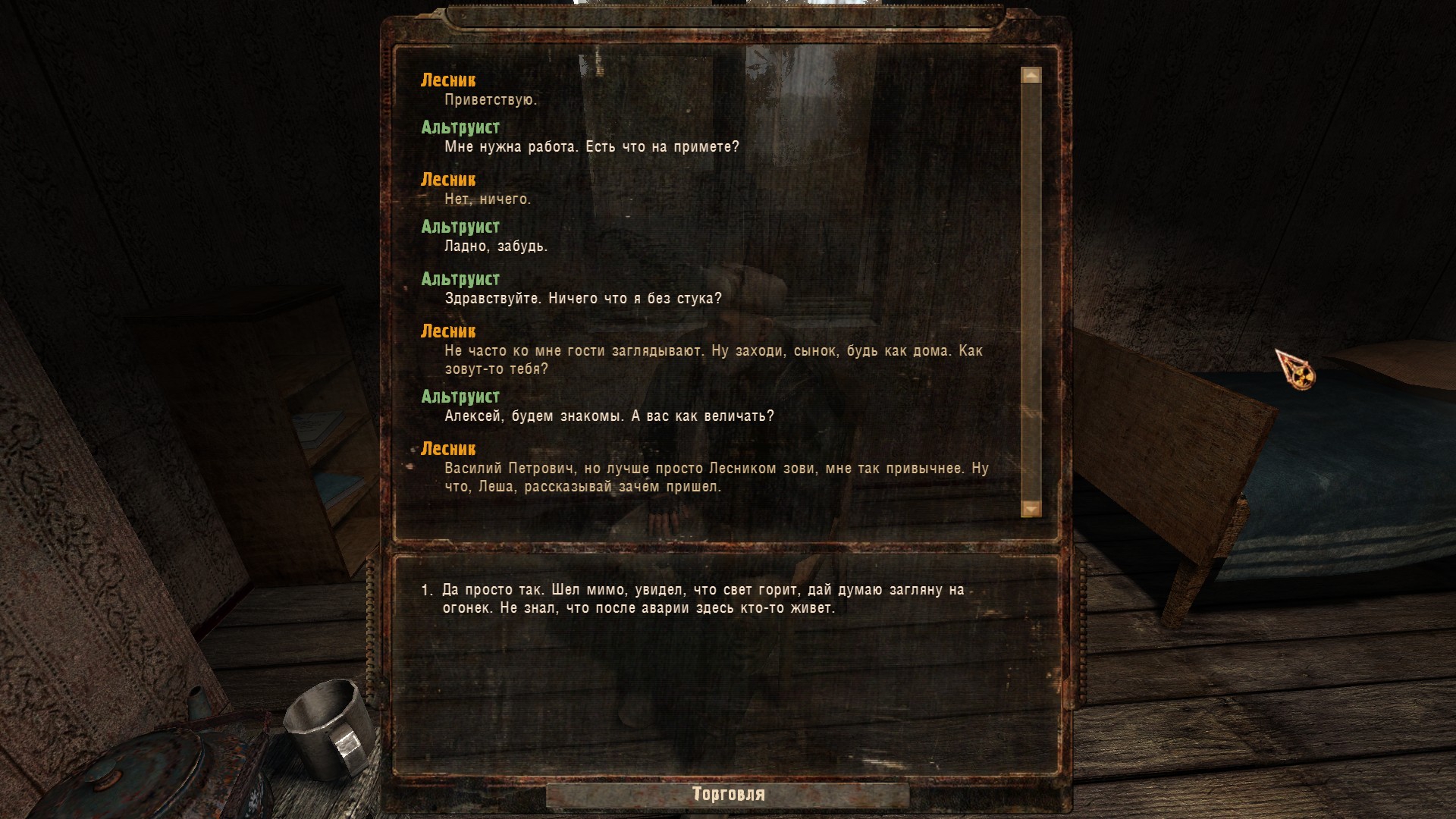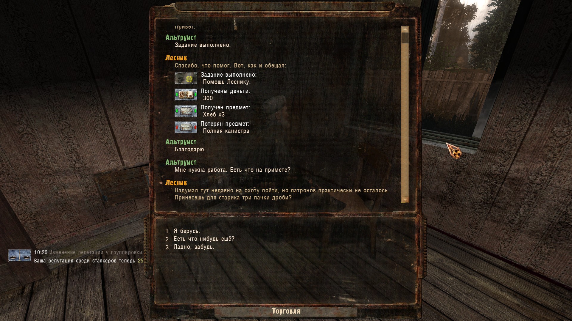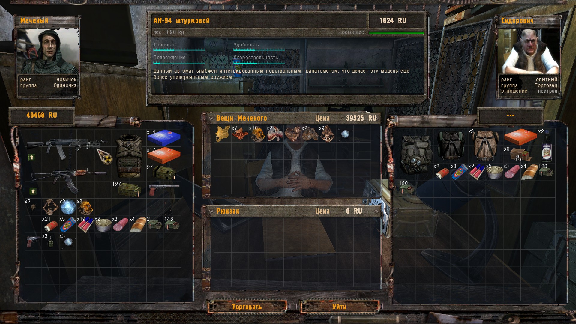 Ну наконец то, гайс. Залутал крафт патриков с желтого тайничка на ростке, экономика забега спасена. Взял по квесту себе в команду долговца, на которого висел свободовский квест на устранение, ему надо за 3к рублей на армейские, смерти ищет малой, не иначе. Взял его с собой, пока так походит, зачем ему на вархаусы. Далее вычинил калашик классический и пестик противомутантисовый, дробик пока отложил, уже денег нет, калак без глушака и прицела будет. Думая взять квест прапора на защиту барахолки.