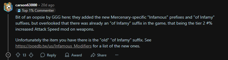>>49999205 тебе уже сказали. если ты прокрутил 2-3 страницы и цены +- одинаковые то это и есть цена. это касаемо базы на которой нихуя нет. если там есть 2+ пассивных скилла то оценивать уже по ним надо. разные комбинации пробуй. еще в кластерах ценятся атрибуты (при условии если есть пассивки). хотя есть кластера на 12 нодов где крафтят эффект 35% и берут условные атак спид, ес/хп, атрибуты и тд. это только с опытом понимание придет, надо знать кто что юзает. например я в прошлой лиге вот такие крафтил. первый стоил где-то 300д+ второй чуть дешевле. это на трикстера инт стак