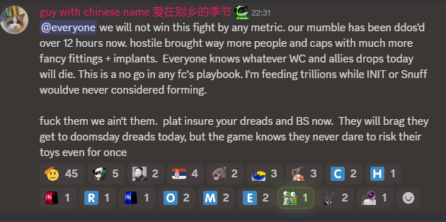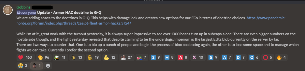Любопытно, что несмотря на весь хайп, а с участием Mittani он был особенно громким, Goon'ы не добивались ранее существенного продвижения. Более того, уже менее чем через две недели им приходилось отступить. Вспомним времена FI.RE и их компании против нас.