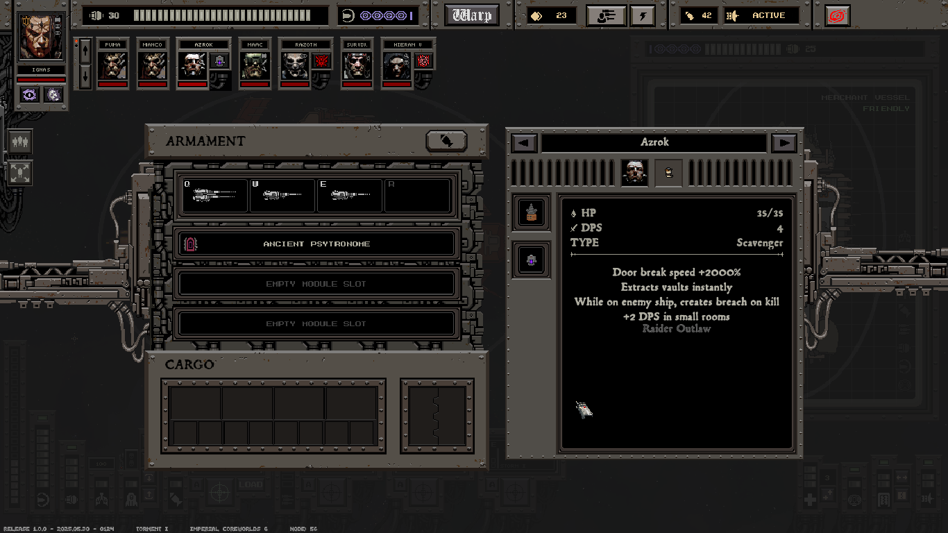 Абордажить местных кхорнитов оказалось довольно хуевой идеей, у всех юнитов 5-7 дпс, жопу грызут мое почтение. >>49905550 План сработал просто охуенно. Да, он довольно ватный, но он очень быстрый. Всякие космодесы банально не успевали его догнать, ибо он дверь выпиливал по ощущению где то за 0.75 секунд. Более быстрые успевали 2-3 хп снять, прежде чем он в новую комнату перейдет. Благодаря ему кстати я пробурился до щитовой у этого босса и устроил там необходимую шумиху, так-как прямого доступа у капсулы не было. А дальше все было просто изи. Толпа псайкеров, 1 из которых имеет 2 заклинания на урон по кораблю и работал 4 пушкой на пол ставочки, 2 псайкер, который дефал его долгие касты своим щитом Этот микро щит реально охуенен, так-как сбивает и ракеты и вражеские заклинания, включая саммонские техножрица с абилкой 20 секундного запрета на починку системы. Еще один псайкер со станом и абилкой на урон, герой ведьма, которой я дал майндконтроль. Просто 0 шансов вычинить щитовую. А дальше просто пушки делали свое дело. >>49905685 У меня в этом ране вообще не везло на защиту от разгерметизации.