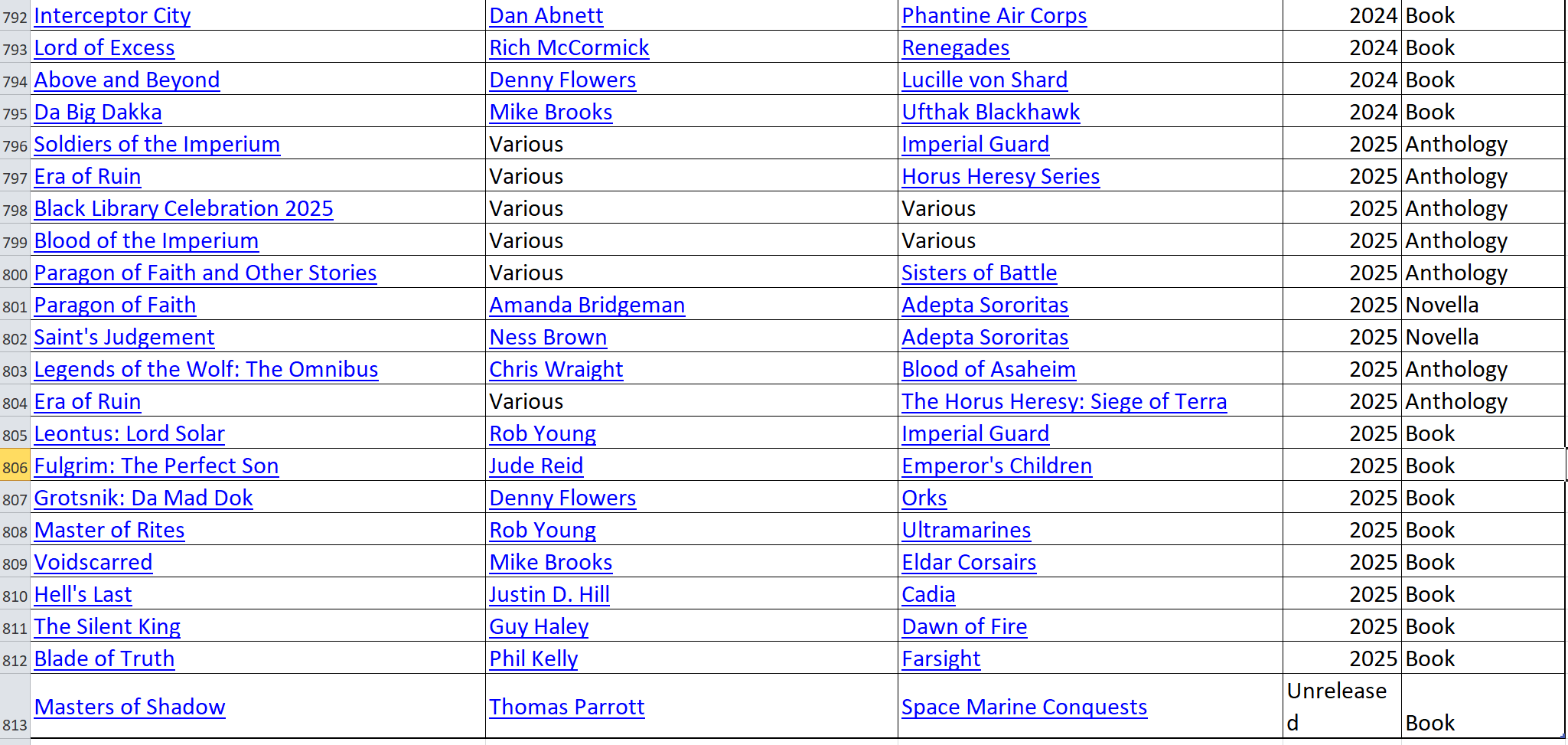 Сидел и от скуки составил таблицу со всеми книгами вархаммера и посчитал общее их число без анталогий и сборников. Оказывается - 683 штуки уникальных книги. Если выкинуть повести, оставив одни романы - то всего 587. За все 90е годы вышло всего 7 книг, из них три - в 1999. За 2002 год вышло уже 9 книг. Самый продуктивный год - 2017 - 46 книг. На втором месте 2020 - 45 книг. В 2024 вышло всего 19 книг.