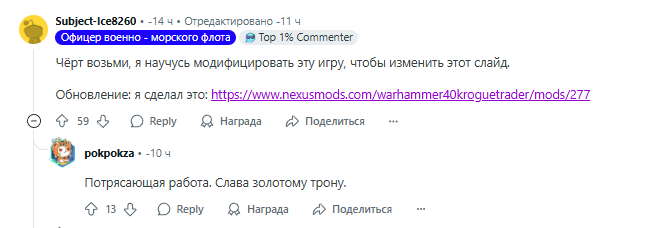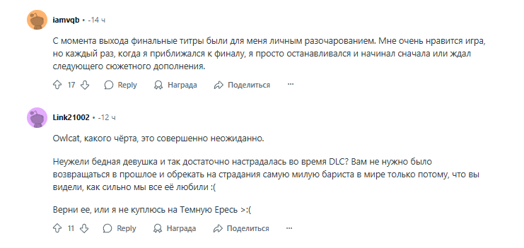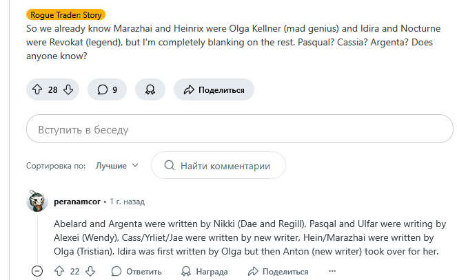 Новости: 1) Первое длц для RT, с компаньоном-ассасинкой культа смерти и расширением корабля — вышло. Второе длц, с компаньоном-негром-арбитесом-пидорасом и его летающим киберпетушатником — вышло и оказалось полным калом, а вместо механики налогов дали усыновление детей в гей-браке. Третье длц про Тразина Неисчислимого и его бляцкий музей запланирован на апрель–июнь 2026 года. Четвёртое длц про космическую помойку запланировано на июль–сентябрь 2026 года. Релизный трейлер Void Shadows: https://www.youtube.com/watch?v=hsgKGORxxXc Релизный трейлер Lex Imperialis: https://www.youtube.com/watch?v=Dh9lu23PCiA 2) Owlcat представила The Expanse: Osiris Reborn, будущая Аction RPG по вселенной Экспансии. Анонсирующий трейлер: https://www.youtube.com/watch?v=pIQifuOTTe8 3) В разработке следующая игра совокотов по вселенной Warhammer 40000 - Dark Heresy. Анонсирующий трейлер: https://www.youtube.com/watch?v=mmfu_Spm-6U 4) Патч 2.5 для ВОТР с реворком мифика Золотого дракона вышел, заодно появилась GOTY версия со всеми контентными дополнениями. Это последнее добавление контента в игру. Кто ждал финального релиза - это он.