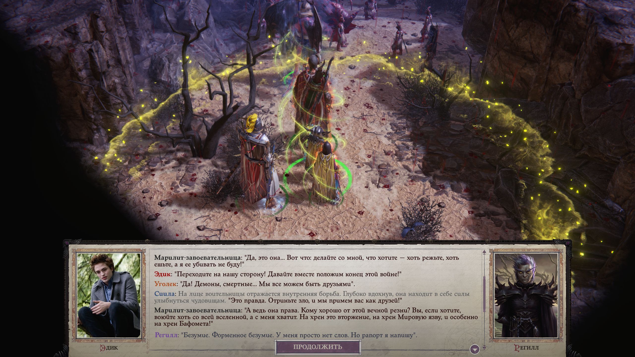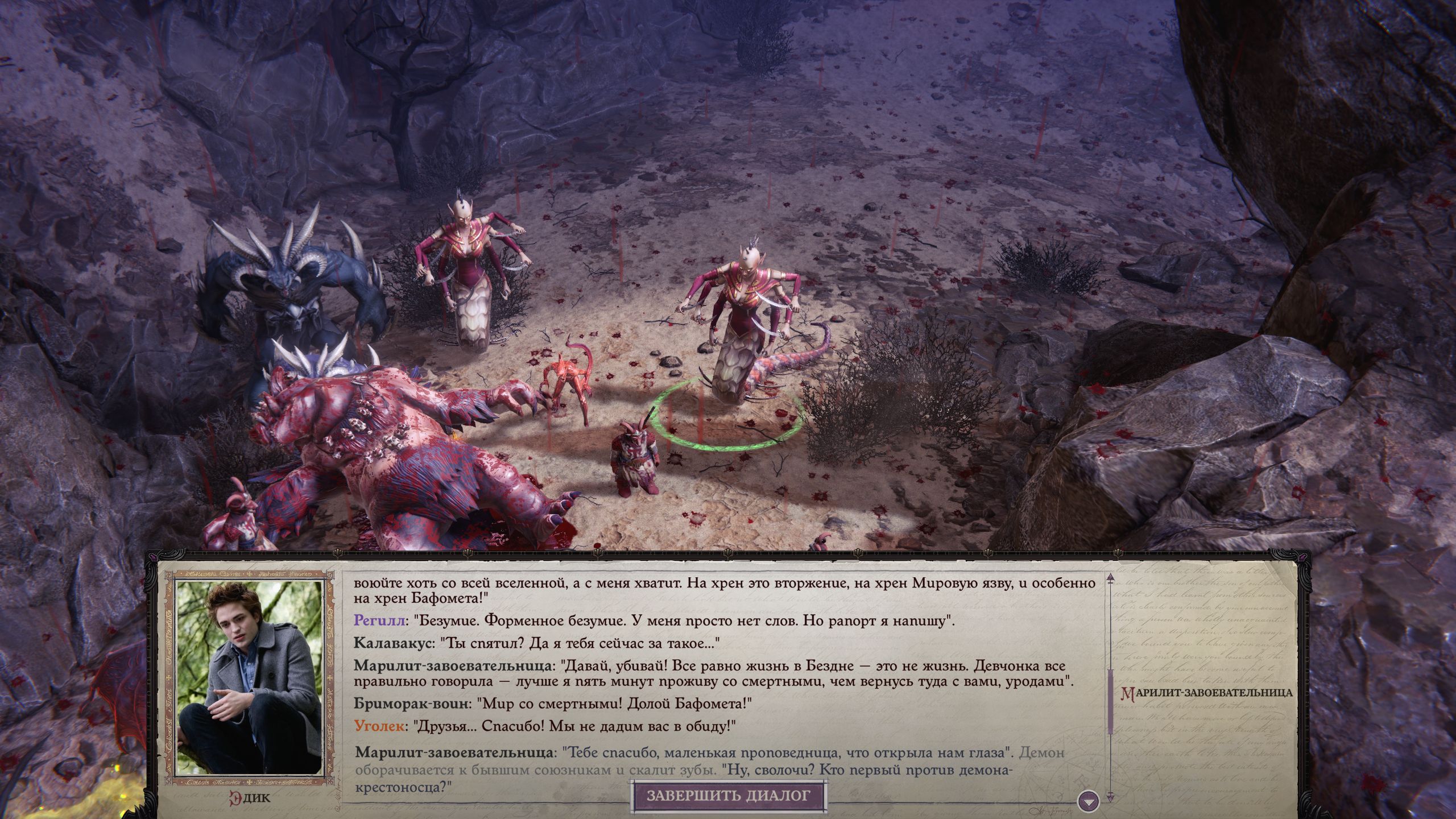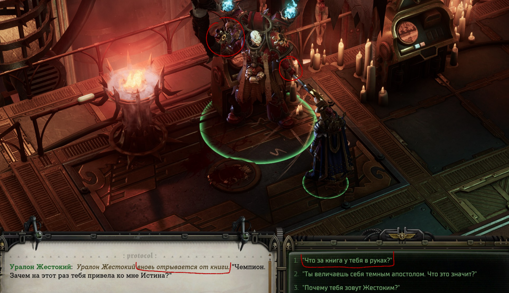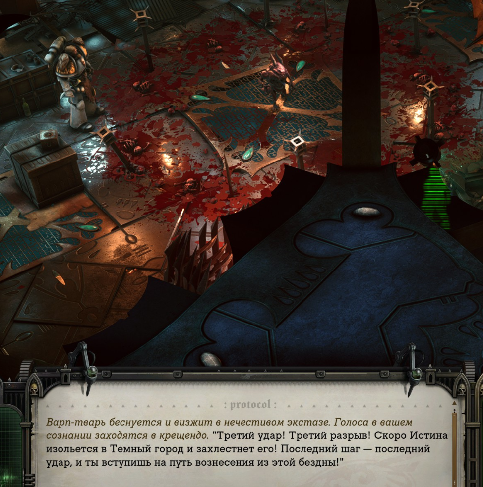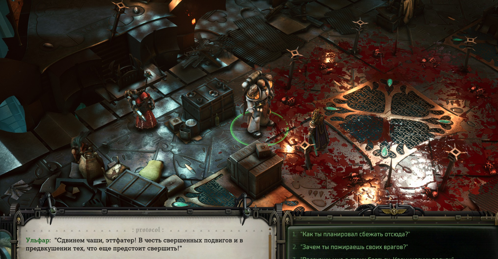 Потом я провожу жертвоприношение людей, появляется демон из варпа посреди литром крови. Ульфар стоит от произошедшего в метре блять. Прямо в этой самой луже ногой стоит. Есть ли у него реакция какая-то? Конечно нет, похуй. Отреагирует ли Ульфар как-то на произошедшее хотя бы в диалоге? Нет, сдвинем чаши, этфатер. Ролевая игра, хули.