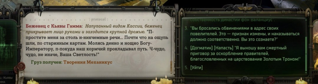 Ну что за мудак писал рут еретика догматика? В какой вселенной это вообще будет нормальным вариантом? При чем, если сначала выбрать 3, то после внезапно дадут ещё две опции догмы, которые уже вполне адекватны ситуации. Или это авторская задумка, призванная показать, что империум - сборище мразей, недостойных называться людьми?