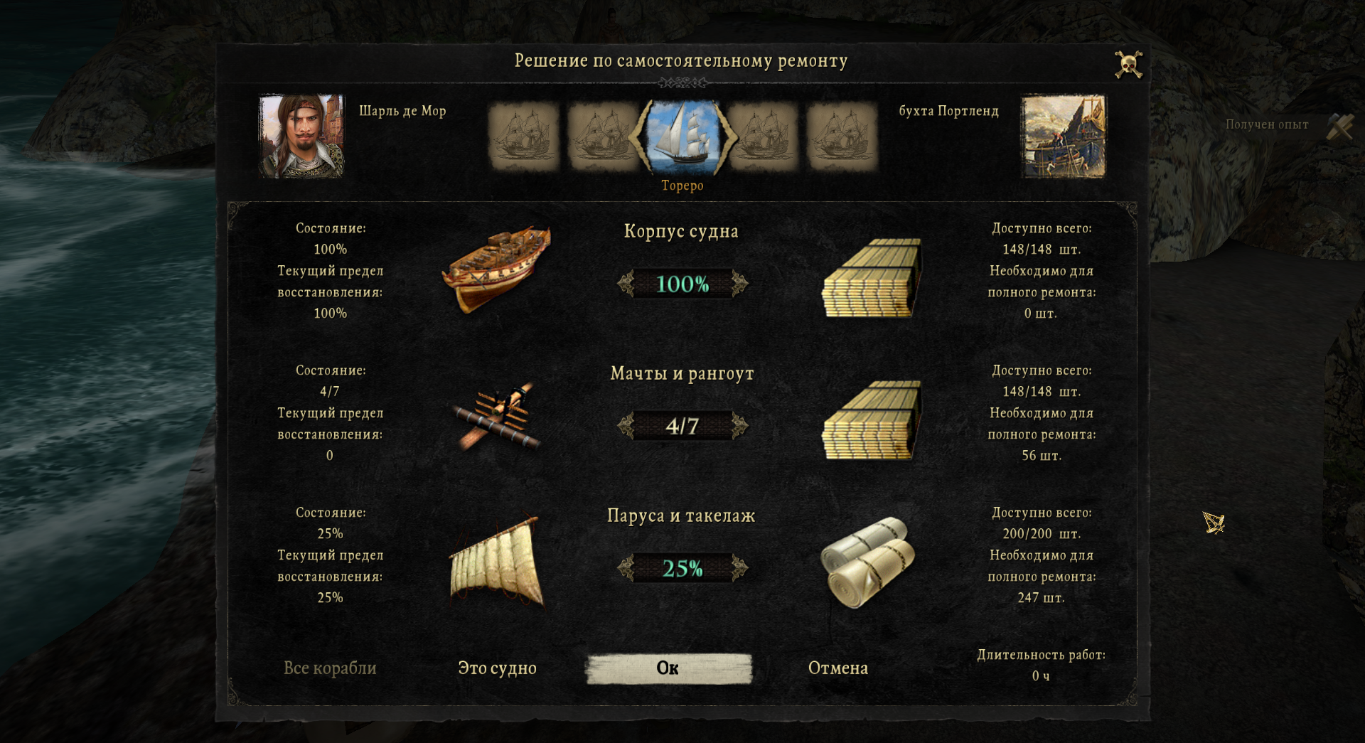 Как вот эта хуйня работает, почему я не могу мачты чинить? В навыке написано, что возможно полное восстановление мачт, доски есть, но на щелчки по стрелке - ноль реакции.