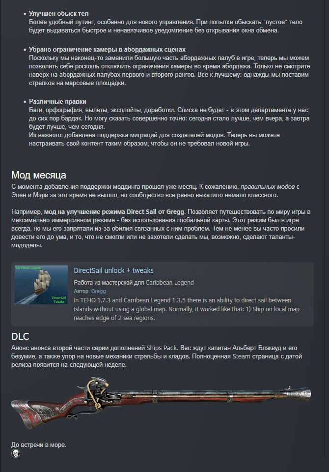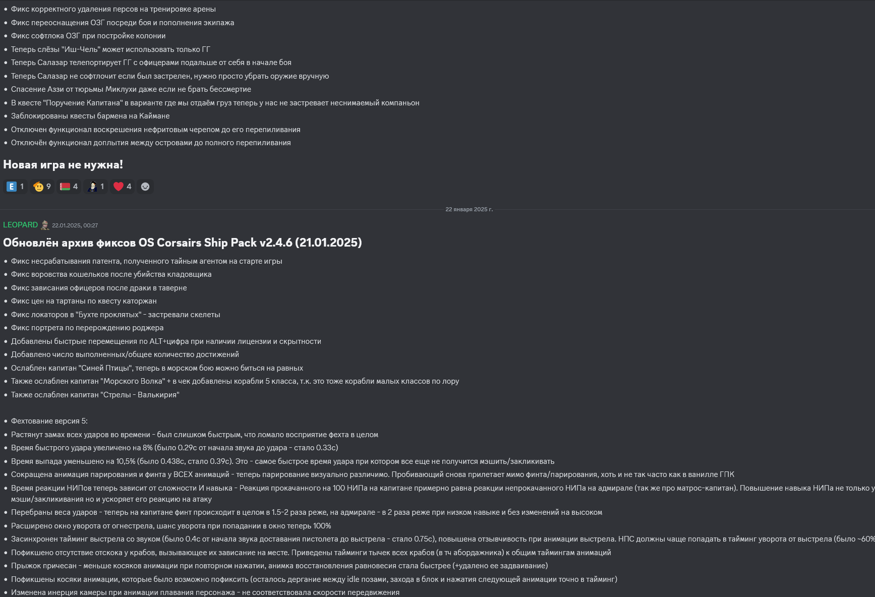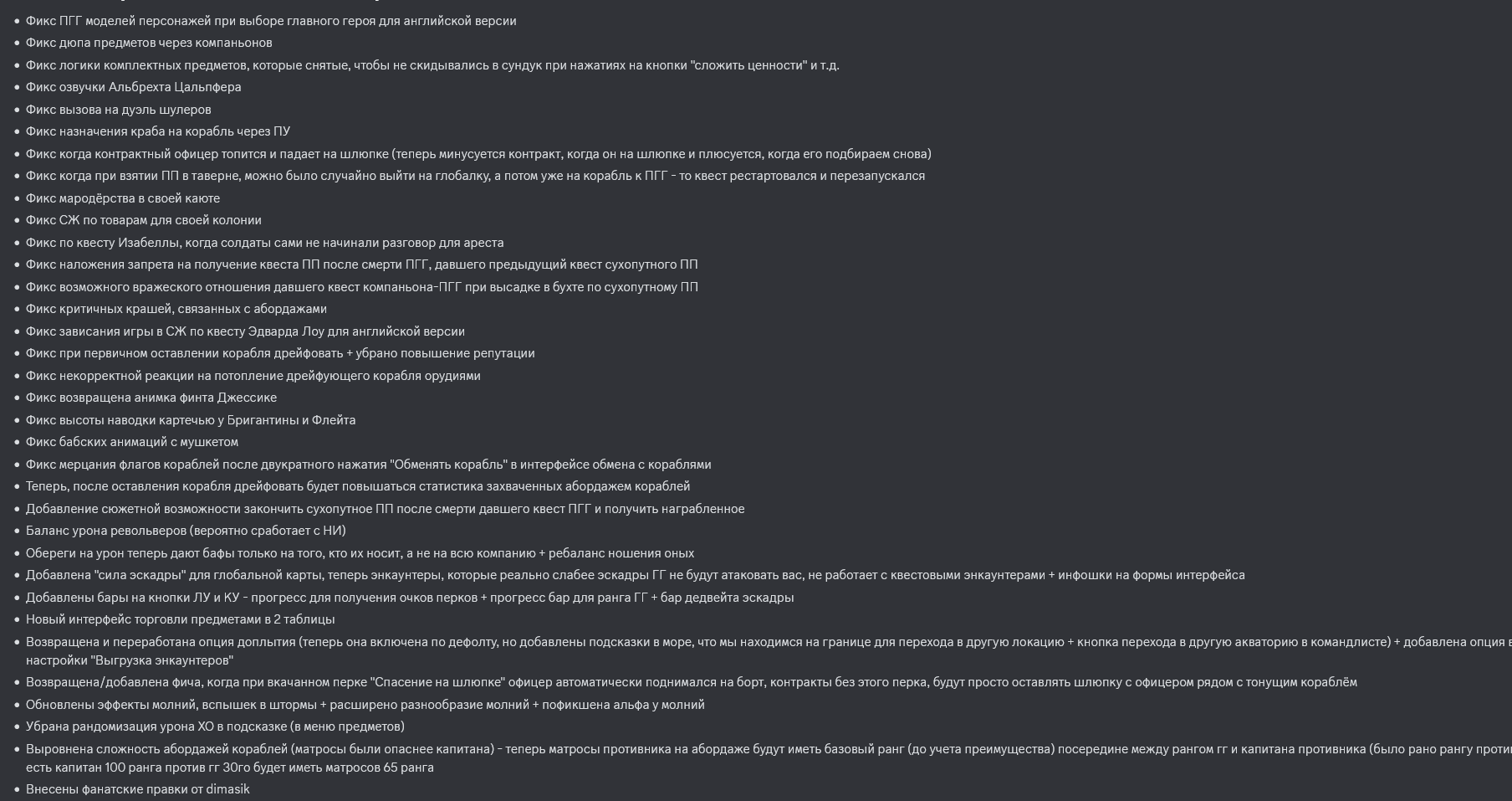 Обновлён архив фиксов OS Corsairs Ship Pack v2.4.6 (09.07.2025) Фикс диалогов по Виспер в инквизиции Фикс неснимаемого пантента Испании Фикс застревания атласа у Тичингиту Фикс возможной смены нации Нассау до прохождения или скипа ЧП Фикс большого шрифта всплывающих сообщений об эффектах Фикс поломки стоянки кораблей в ПУ Фикс невыдачи награды после победы на турнире и обращения к ГГ Фикс упреждения - теперь середина залпа всегда в одной точке (до учета ошибки канонира) Фикс команды форта после его грабежа/захвата - теперь гарнизон восстанавливается полностью (до этого восстанавливалось примерно 1000 человек) Фикс обрезания солнца горизонтом Фикс обрезания луны горизонтом Фикс матрицы обмена камней у ростовщика Фикс появления кириллицы там, где должна быть латиница Фикс ломающегося диалога с генерал-губернатором Фикс сдающихся капитанов у Рифа скелета по линейке Виспер Фикс слишком частого появления нанимаемых семьёй Гатри ОЗГ Фикс конфликта квеста "Работорговец" с другими квестами Фикс связанного с ПГГ софтлока у торговца при выполнении фрахта Фикс офицеры больше не лечат отравления несуществующими микстурами Фикс офицеры могут выпить ром для лечения отравления Фикс убрано неестественное дёргание персонажа при получении ударов и парировании Фикс анимация перехода из получения удара в блок для ГГ теперь плавная Твик - анимация успешного парирования стала дольше - теперь снова можно бить вдогонку после парирования Твик - НПС на сложности "Матрос" больше не отскакивают (ни от выстрелов, ни от ударов) Запрет взятия на абордаж кораблей из штормовой эскадры Сделан линейный залп кораблям. Чем меньше пушек на борту (и/или навыка "Пушки"), тем больше он стреляет вразнобой. Если пушек (на корабле/форте в целом) больше 50 то залп ускоряется. У погонных орудий есть небольшой бонус на время залпа и точность Теперь для нанесения урона по форту достаточно попадать по его модели (стены). Также его можно разозлить при попадании по его стенам. На Матросе нужно повредить форт на 50%, чтобы он перестал стрелять; на Капитане - 75%, на Адмирале - полностью. Урон по матросам отскейлен под эти значения. Урон от уничтожения орудий остался без изменений Добавлен бонус в точность снарядов при стрельбе от первого лица (точность увеличена в 2,5 раза до учета ширины борта) Добавлена живая выгрузка ПГГ на глобалку (раньше они выгружались только через загрузки при переходах, теперь же в реалтайме) Интегрирован код автосмены боеприпасов от dimasik Запрет автосейва перед абордажем для игры в режиме хардкора. Теперь в режиме хардкора этой опции не будет в списке доступных Адаптация квестов ККС от MrGingerBead Небольшой ребаланс холодного оружия: среднее оружие по урону поднято до тяжёлого, тяжёлое оружие ребалансированно по эффектам (для изменений потребуется новая игра, сейвы не сломаются), немного сбалансирован урон у белого и ржавого оружия для перехода к следующему тиру Поправлено направление пушек кораблей в энциклопедии и на верфи Почти во всех окнах интерфейса поправлена вёрстка и разметка интерфейса + сделаны обрамления, чтобы выглядело аккуратно и лаконично Добавлены бары морали в меню трансфера команды между кораблями + в таверну Обновлены иконки товаров Убрана зеркальность таблиц в интерфейсе предметами Заменена цена покупки в таблицах на цену продажи Увеличена ширин