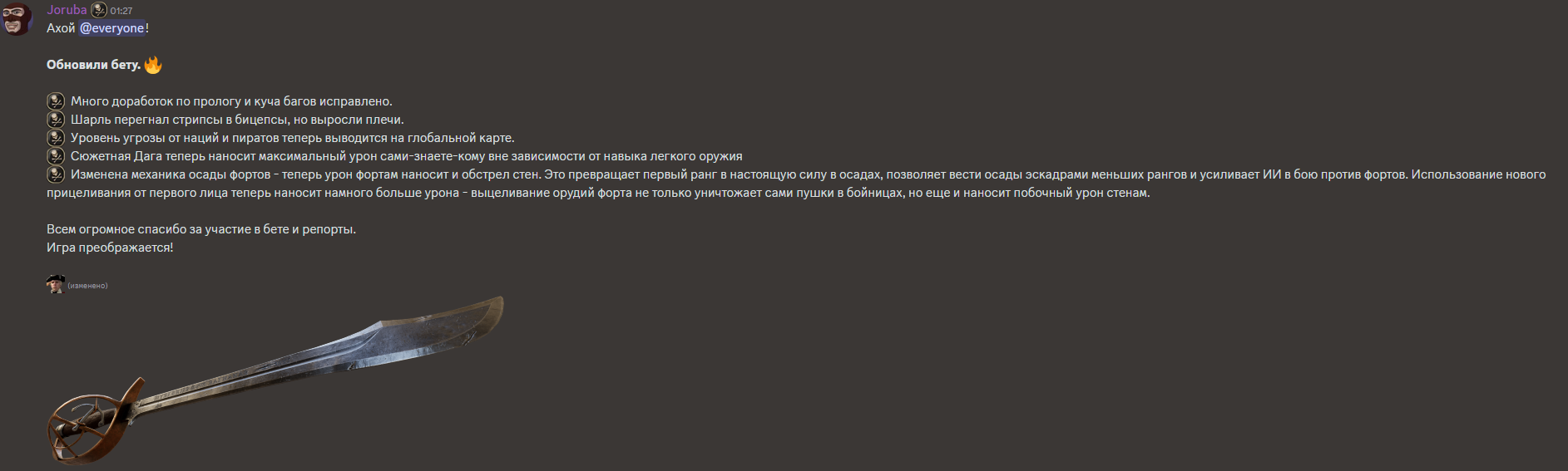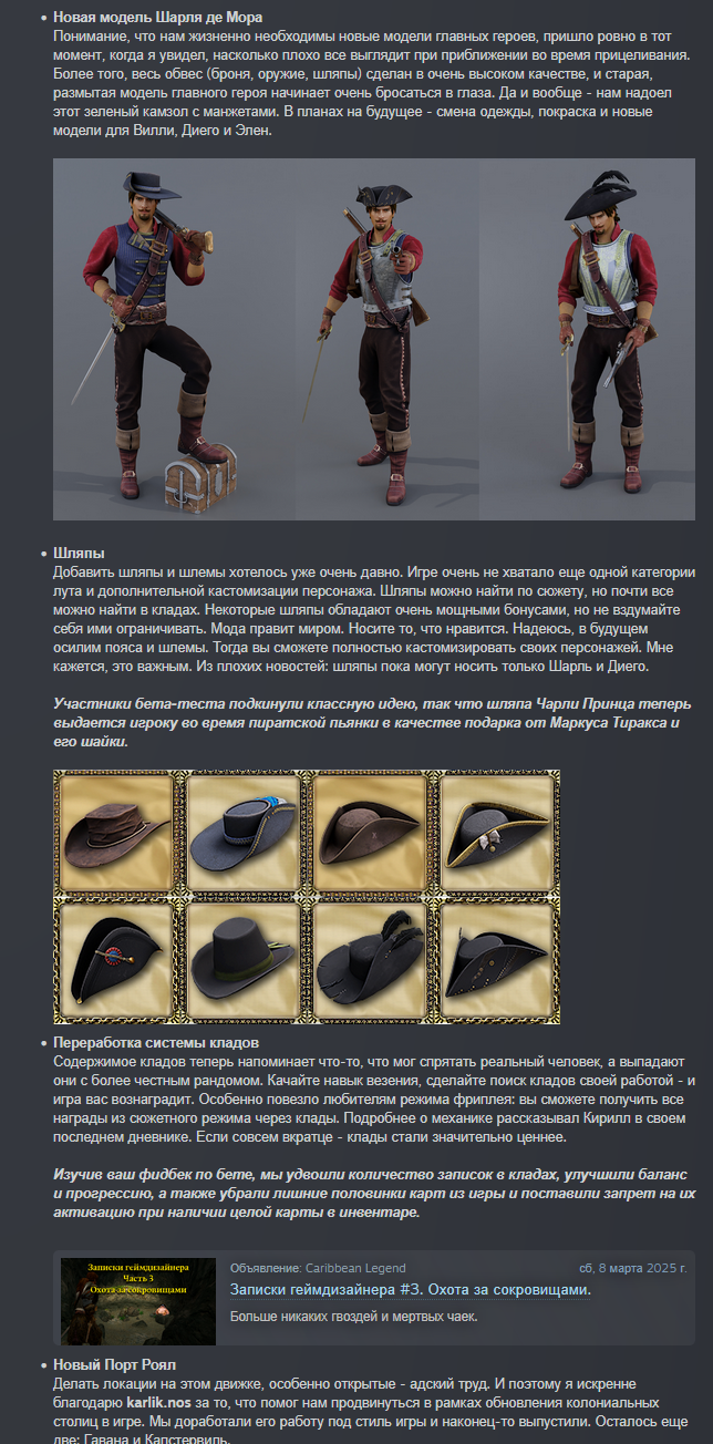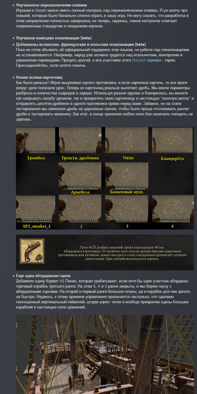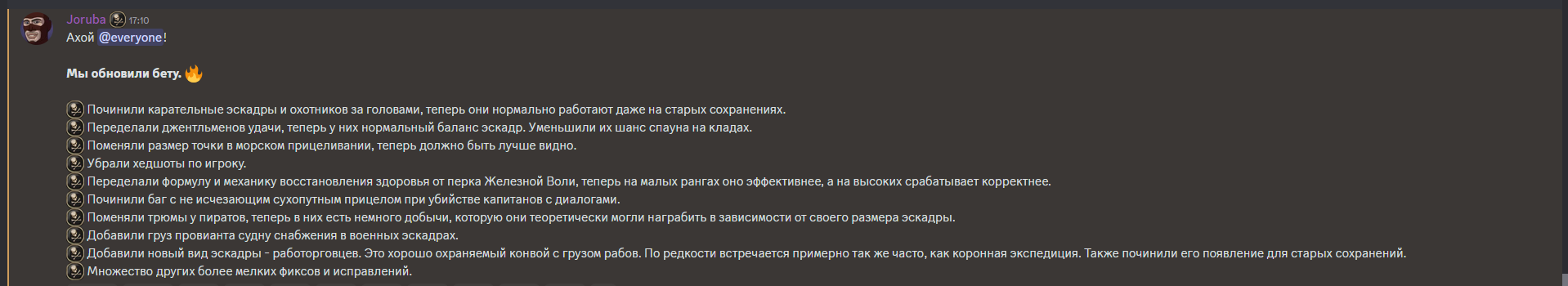 Обновлён архив фиксов OS Corsairs Ship Pack v2.4.6 (09.07.2025) Фикс диалогов по Виспер в инквизиции Фикс неснимаемого пантента Испании Фикс застревания атласа у Тичингиту Фикс возможной смены нации Нассау до прохождения или скипа ЧП Фикс большого шрифта всплывающих сообщений об эффектах Фикс поломки стоянки кораблей в ПУ Фикс невыдачи награды после победы на турнире и обращения к ГГ Фикс упреждения - теперь середина залпа всегда в одной точке (до учета ошибки канонира) Фикс команды форта после его грабежа/захвата - теперь гарнизон восстанавливается полностью (до этого восстанавливалось примерно 1000 человек) Фикс обрезания солнца горизонтом Фикс обрезания луны горизонтом Фикс матрицы обмена камней у ростовщика Фикс появления кириллицы там, где должна быть латиница Фикс ломающегося диалога с генерал-губернатором Фикс сдающихся капитанов у Рифа скелета по линейке Виспер Фикс слишком частого появления нанимаемых семьёй Гатри ОЗГ Фикс конфликта квеста "Работорговец" с другими квестами Фикс связанного с ПГГ софтлока у торговца при выполнении фрахта Фикс офицеры больше не лечат отравления несуществующими микстурами Фикс офицеры могут выпить ром для лечения отравления Фикс убрано неестественное дёргание персонажа при получении ударов и парировании Фикс анимация перехода из получения удара в блок для ГГ теперь плавная Твик - анимация успешного парирования стала дольше - теперь снова можно бить вдогонку после парирования Твик - НПС на сложности "Матрос" больше не отскакивают (ни от выстрелов, ни от ударов) Запрет взятия на абордаж кораблей из штормовой эскадры Сделан линейный залп кораблям. Чем меньше пушек на борту (и/или навыка "Пушки"), тем больше он стреляет вразнобой. Если пушек (на корабле/форте в целом) больше 50 то залп ускоряется. У погонных орудий есть небольшой бонус на время залпа и точность Теперь для нанесения урона по форту достаточно попадать по его модели (стены). Также его можно разозлить при попадании по его стенам. На Матросе нужно повредить форт на 50%, чтобы он перестал стрелять; на Капитане - 75%, на Адмирале - полностью. Урон по матросам отскейлен под эти значения. Урон от уничтожения орудий остался без изменений Добавлен бонус в точность снарядов при стрельбе от первого лица (точность увеличена в 2,5 раза до учета ширины борта) Добавлена живая выгрузка ПГГ на глобалку (раньше они выгружались только через загрузки при переходах, теперь же в реалтайме) Интегрирован код автосмены боеприпасов от dimasik Запрет автосейва перед абордажем для игры в режиме хардкора. Теперь в режиме хардкора этой опции не будет в списке доступных Адаптация квестов ККС от MrGingerBead Небольшой ребаланс холодного оружия: среднее оружие по урону поднято до тяжёлого, тяжёлое оружие ребалансированно по эффектам (для изменений потребуется новая игра, сейвы не сломаются), немного сбалансирован урон у белого и ржавого оружия для перехода к следующему тиру Поправлено направление пушек кораблей в энциклопедии и на верфи Почти во всех окнах интерфейса поправлена вёрстка и разметка интерфейса + сделаны обрамления, чтобы выглядело аккуратно и лаконично Добавлены бары морали в меню трансфера команды между кораблями + в таверну Обновлены иконки товаров Убрана зеркальность таблиц в интерфейсе предметами Заменена цена покупки в таблицах на цену продажи Увеличена ширин