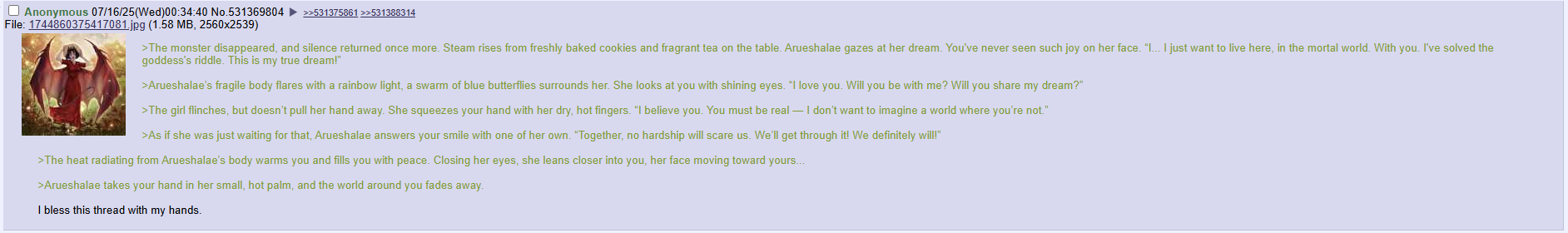 >Хрупкое тело Арушалай вспыхивает радужным светом, ее окутывает стая голубых бабочек. Она смотрит на вас сияющими глазами. "Я люблю тебя. Ты будешь со мной? Ты разделишь мою мечту?"