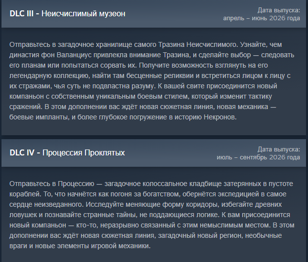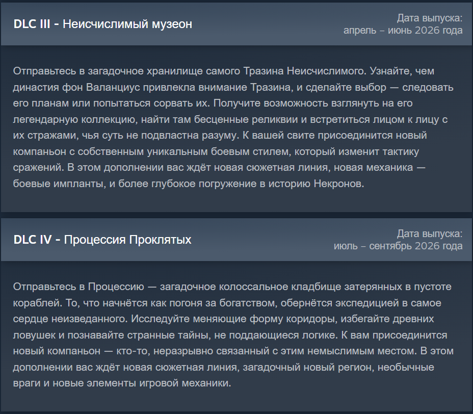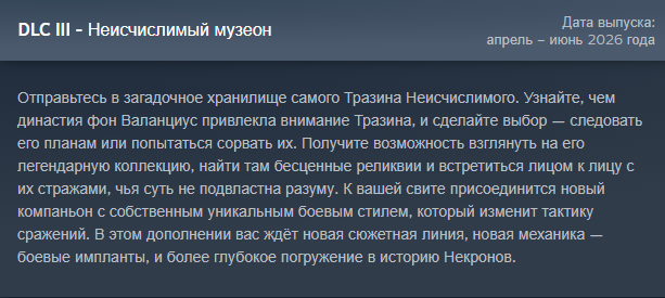 Новости: 1) Первое длц для RT, с компаньоном-ассасинкой культа смерти и расширением корабля — вышло. Второе длц, с компаньоном-негром-арбитесом-пидорасом и его летающим киберпетушатником — вышло и оказалось полным калом, а вместо механики налогов дали усыновление детей в гей-браке. Третье длц про Тразина Неисчислимого и его бляцкий музей запланирован на апрель–июнь 2026 года. Четвёртое длц про космическую помойку запланировано на июль–сентябрь 2026 года. Релизный трейлер Void Shadows: https://www.youtube.com/watch?v=hsgKGORxxXc Релизный трейлер Lex Imperialis: https://www.youtube.com/watch?v=Dh9lu23PCiA 2) Owlcat представила The Expanse: Osiris Reborn, будущая Аction RPG по вселенной Экспансии. Анонсирующий трейлер: https://www.youtube.com/watch?v=pIQifuOTTe8 3) В разработке следующая игра совокотов по вселенной Warhammer 40000 - Dark Heresy. Анонсирующий трейлер: https://www.youtube.com/watch?v=mmfu_Spm-6U 4) Патч 2.5 для ВОТР с реворком мифика Золотого дракона вышел, заодно появилась GOTY версия со всеми контентными дополнениями. Это последнее добавление контента в игру. Кто ждал финального релиза - это он.