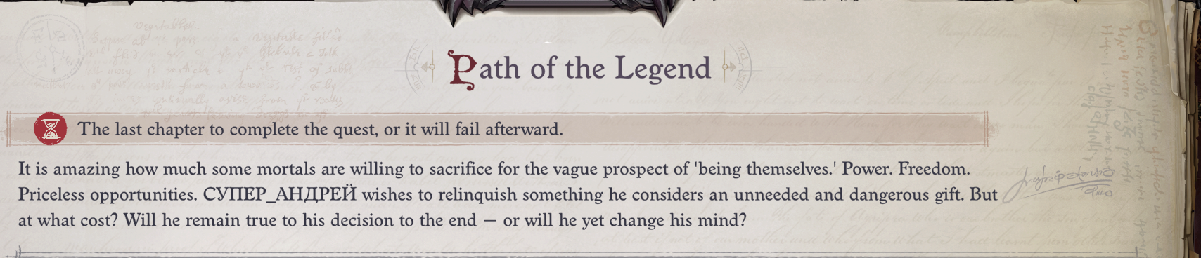 >Чудовище исчезло, и вокруг вновь стало тихо. На столе поднимается пар от свежего печенья и ароматного чая. Арушалай окидывает свою мечту взглядом. Вы никогда не видели на ее лице такой радости. "Я... Просто хочу жить здесь, в мире смертных. С тобой. Я разгадала загадку богини. Вот моя настоящая мечта!"