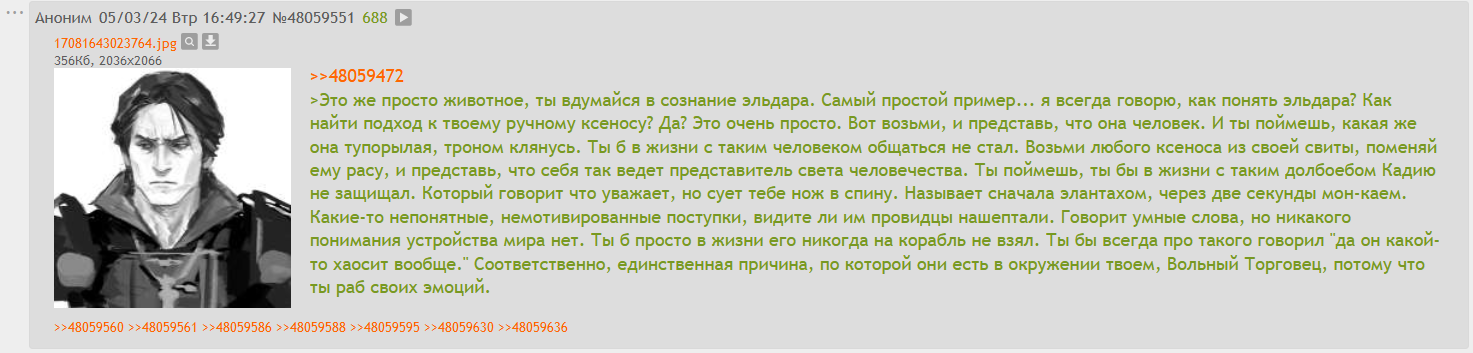 >>50038885 > В реале это тоталитарное государство Как ты собираешься своим железным кулаком тоталитарить если чел от тебя в литерали тысячах-миллионах световых лет и контроллировать его никак физически невозможно? > По сути концепция РТ придумана исключительно для того чтобы оправдать геймплей настолки, в реале её бы упразднили сразу после того как первые ВТ все перешли в ересь и сепаратизм. Самая первая версия настольной вахи называлась рог трейдер и была про маринов, так что ты неправ. И их бы не распустили как не распустили маринов и тд после ереси. Достаточно вставить палки в колеса для будущих предавал, что и сделали после ереси по абсолютно всем структурам в империуме. >>50038910 > Император это труп на троне, всем правят Лорды Терры. Император такой труп что по всей галактике чудеса творит не поднимая жопы, а когда надо через всю галактику кастует золотых аватаров или вселяется в кого-нибудь. Лорды терры правят только пока делают нормально. Как император говорит кустодиям сделать дело или начинается совсем хуйня вроде ереси вандира, то лордов терры расстреливают и смещают, это уже происходило раз 5.