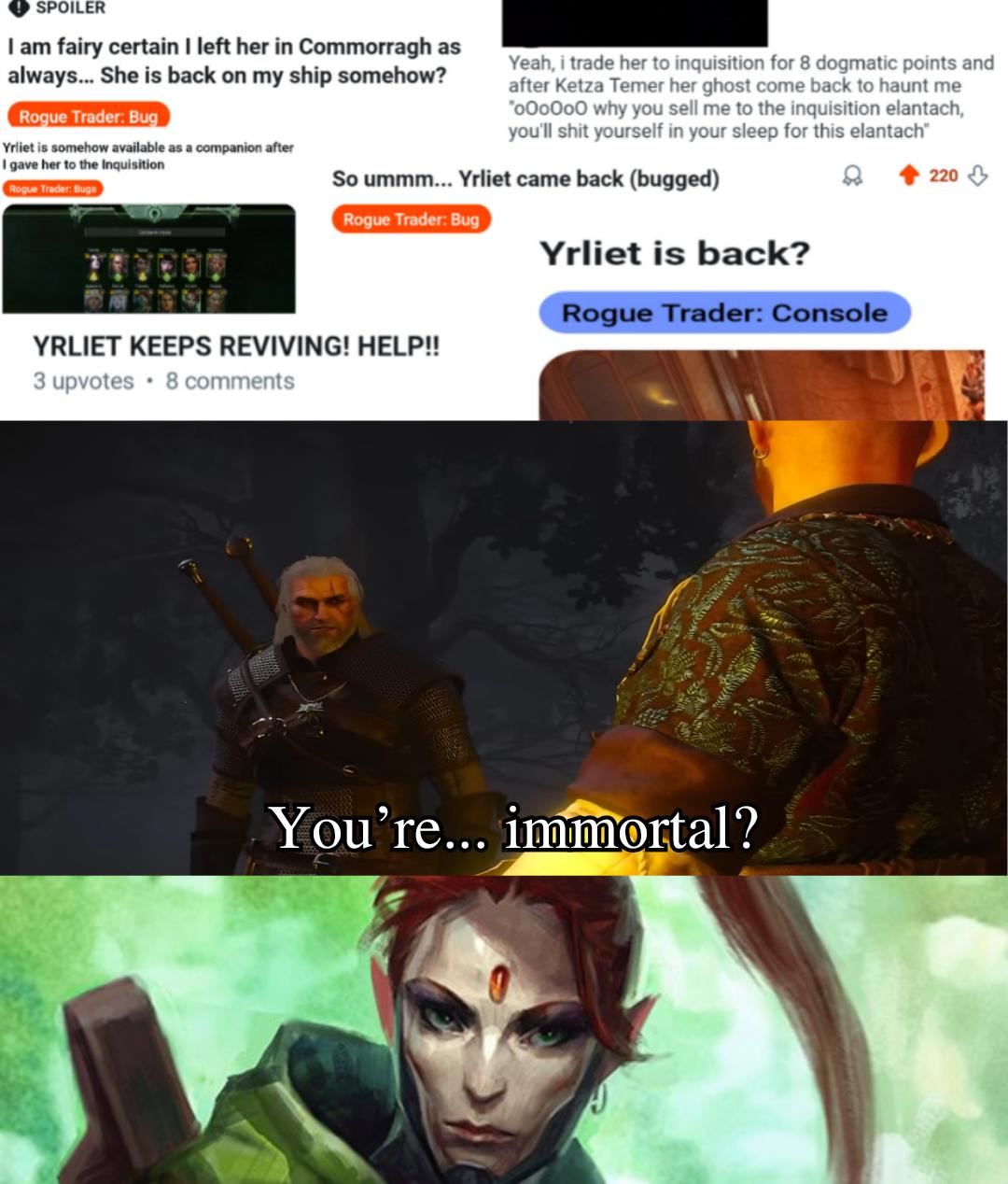 Зачем я вообще это простыню пишу? Потому что как игра по вахе, Роуг трейдер это топ. Лор, окружение, атмосфера, это всё пиздато. Но совокоты походу подзабыли, что это в первую очередь РПГ на 70+ часов, из которых 60 часов это бои, а эти самые бои после определенного момента становятся абсолютно неинтересным калом, и с каждым ДЛЦ всё только хуже и хуже. Причём с каждым длц, очевидно, этих говнобоёв становится всё больше. В том же Вотр даже со всеми длц последний акт реально представляет какой-то челлендж даже на нормале. В РТ на нечестном после 3 игра становится симулятором повторения 1 одинакового хода. И я не уверен, что выдержу очередные уже 80 часов этого терпения, когда выйдет следующее дополнение.