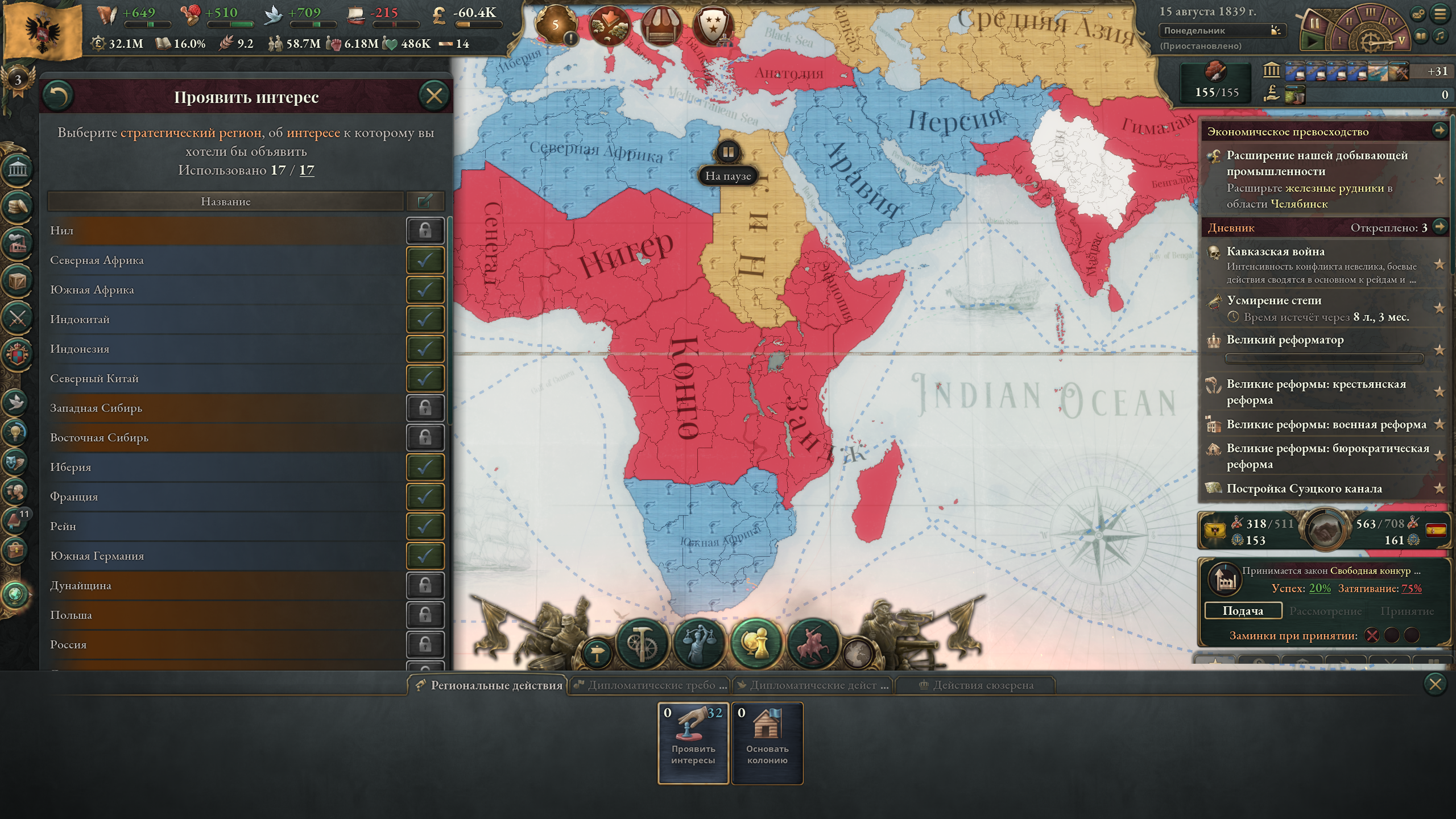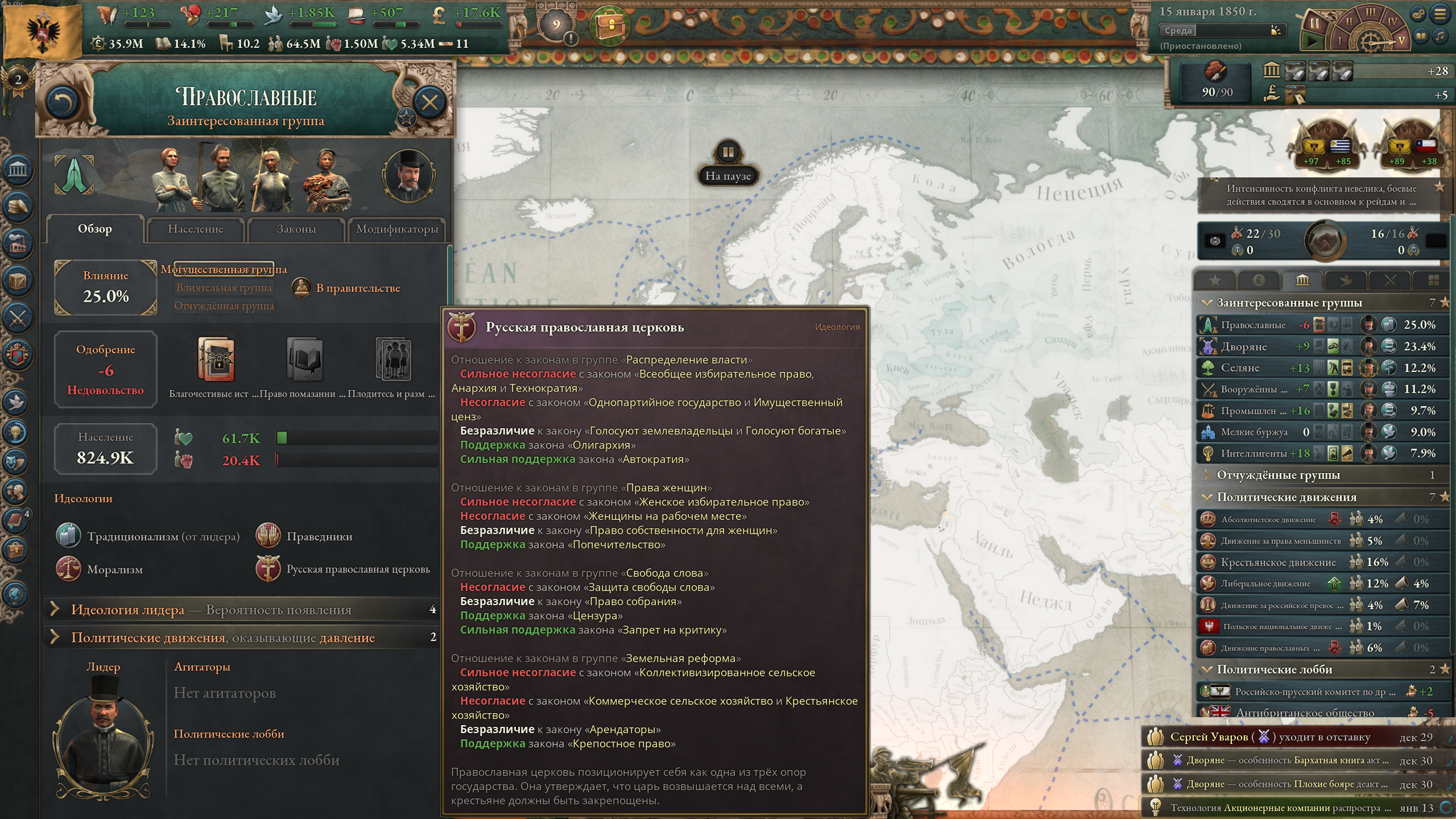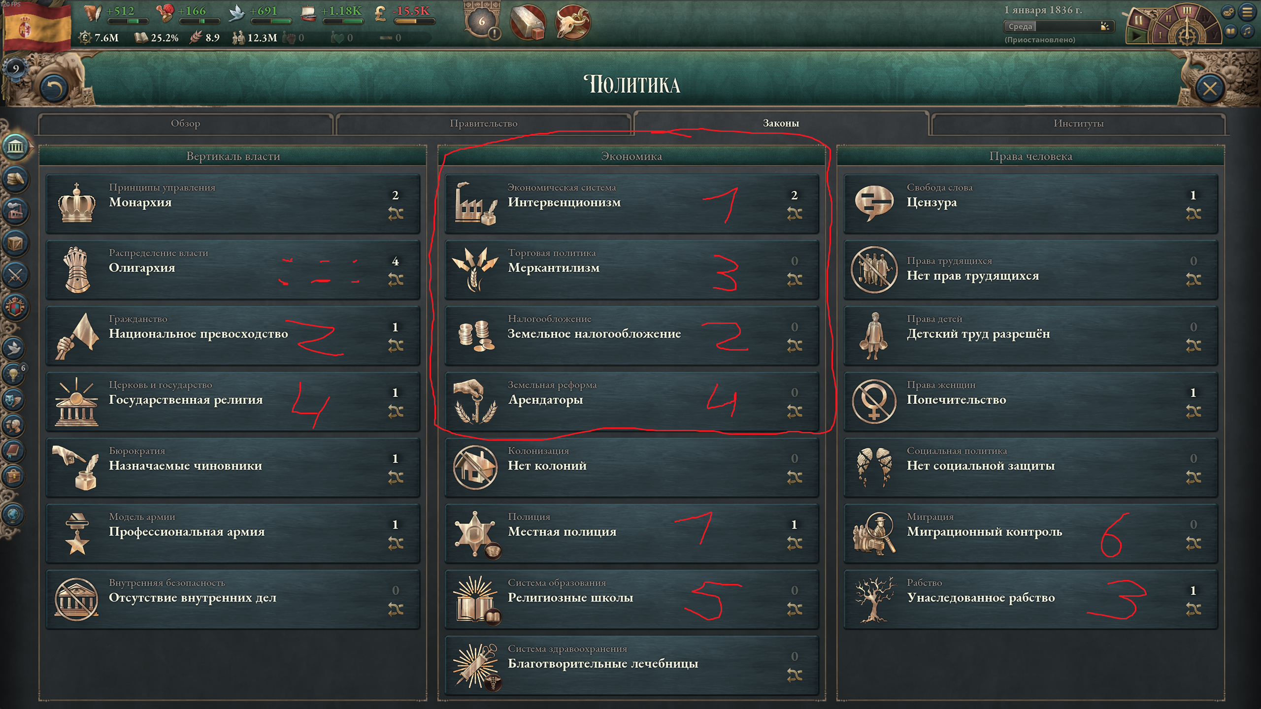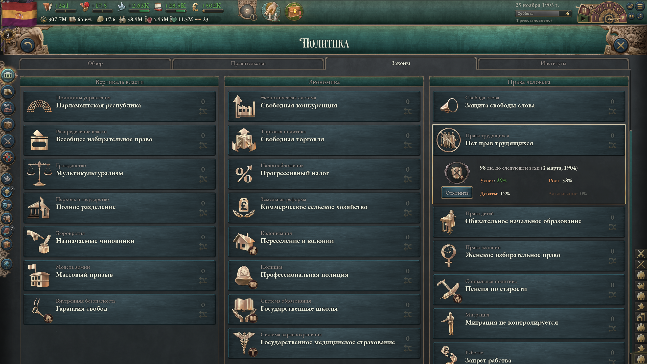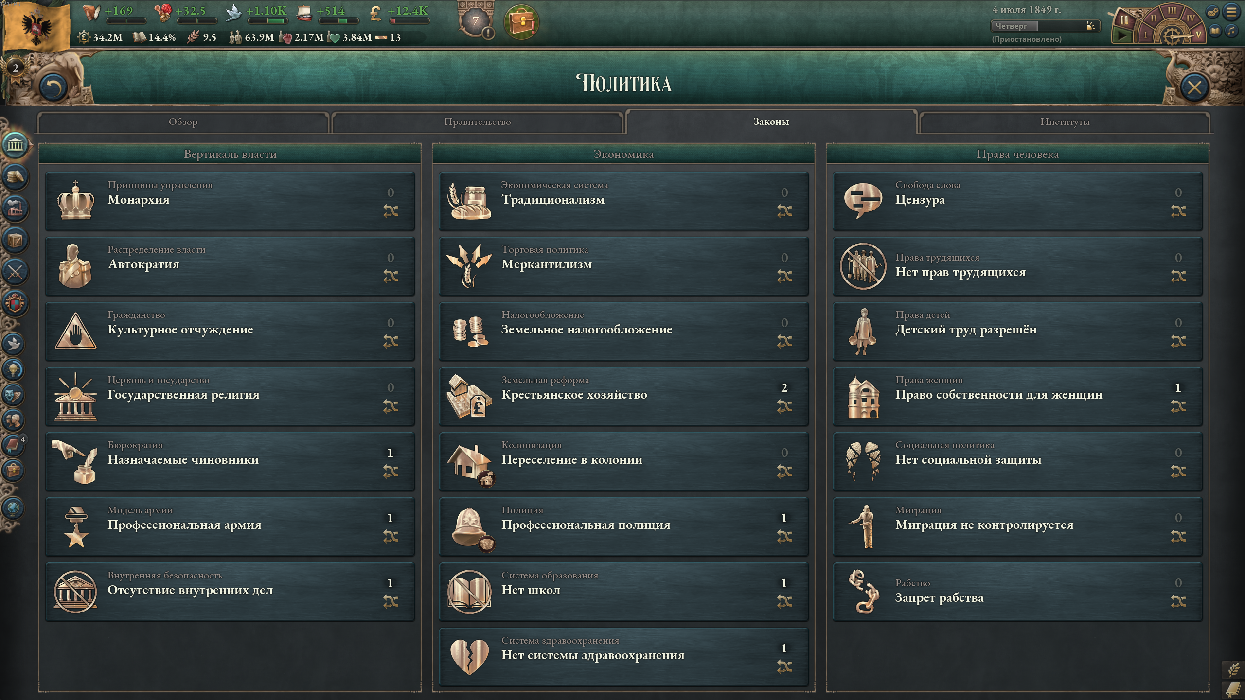 С этого момента влияние дворян постепенно будет сходить на нет. Когда промышленники наберут массу, поменяю экономические законы. После этого возьмусь за ликвидацию священников.