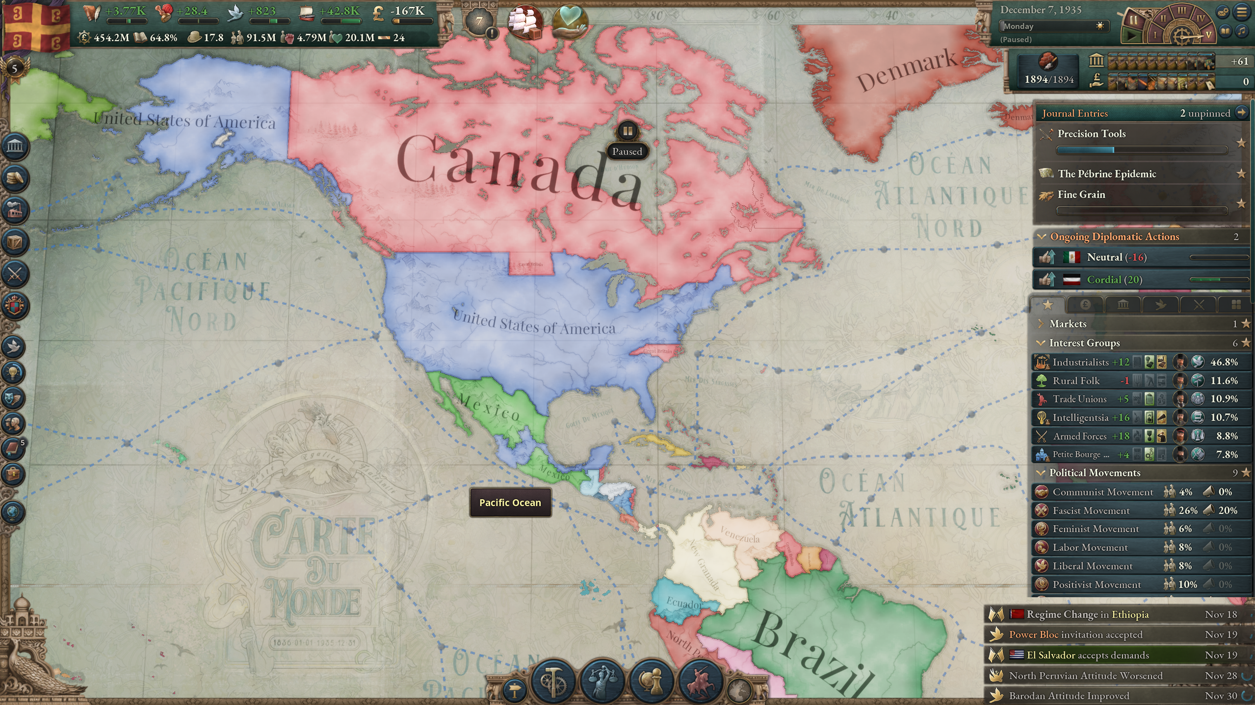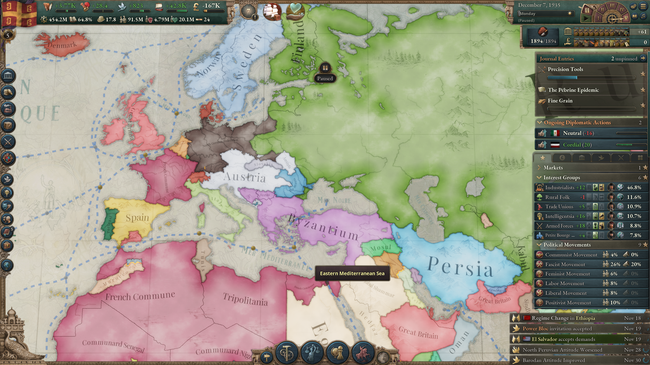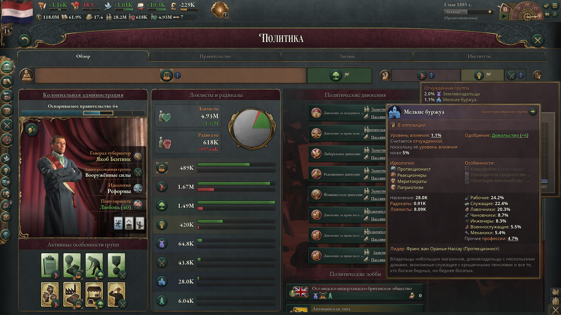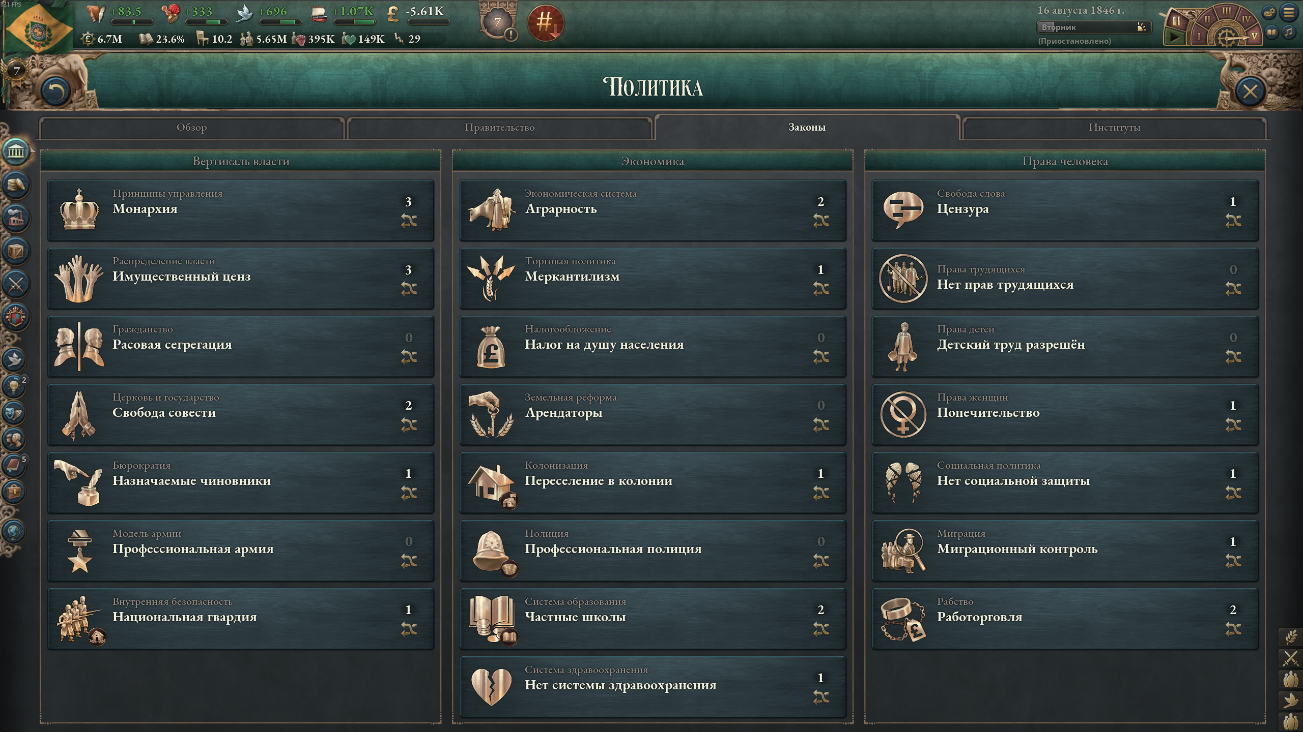 Не замечал раньше, но оказывается у некоторых стран бонусы политгрупп уникальны. Вот у франции хуита на престиж. А у бразилии легетимный отыгрыш от землевладельцев