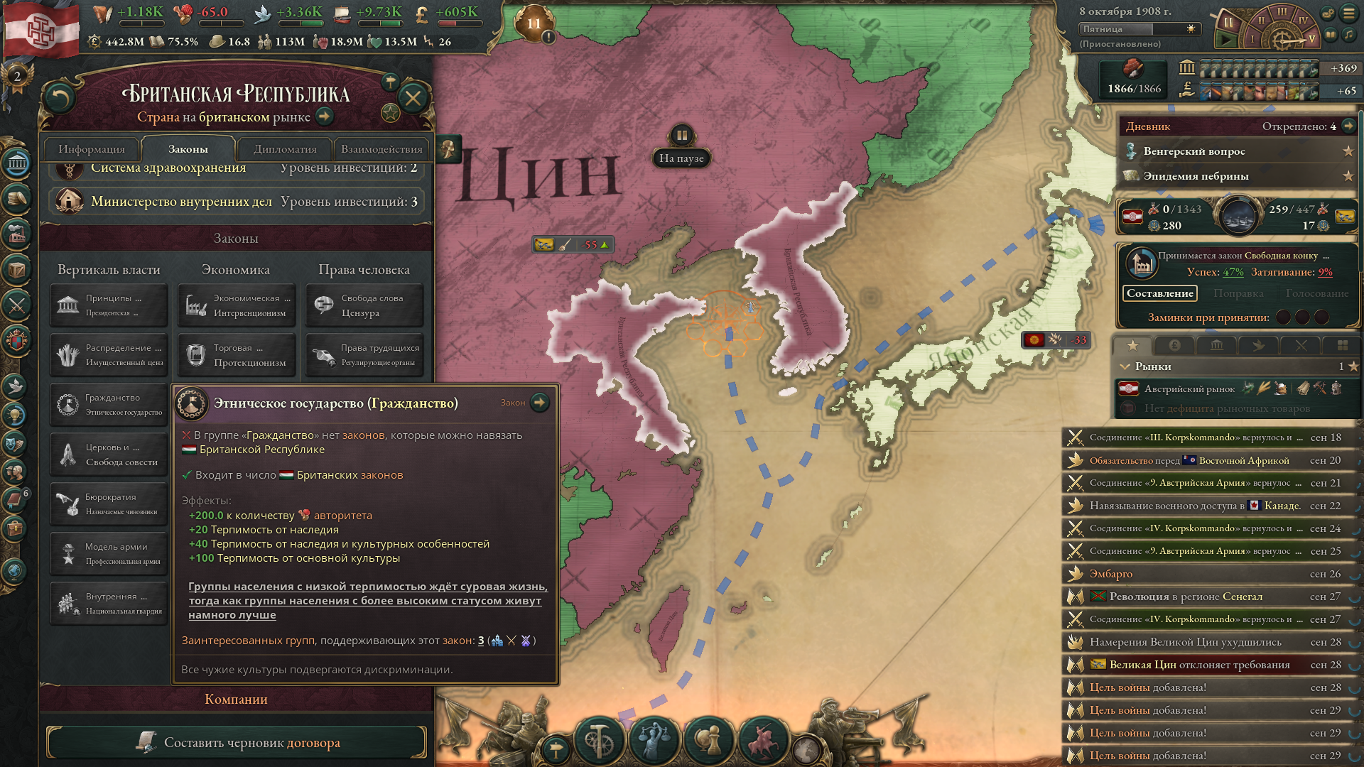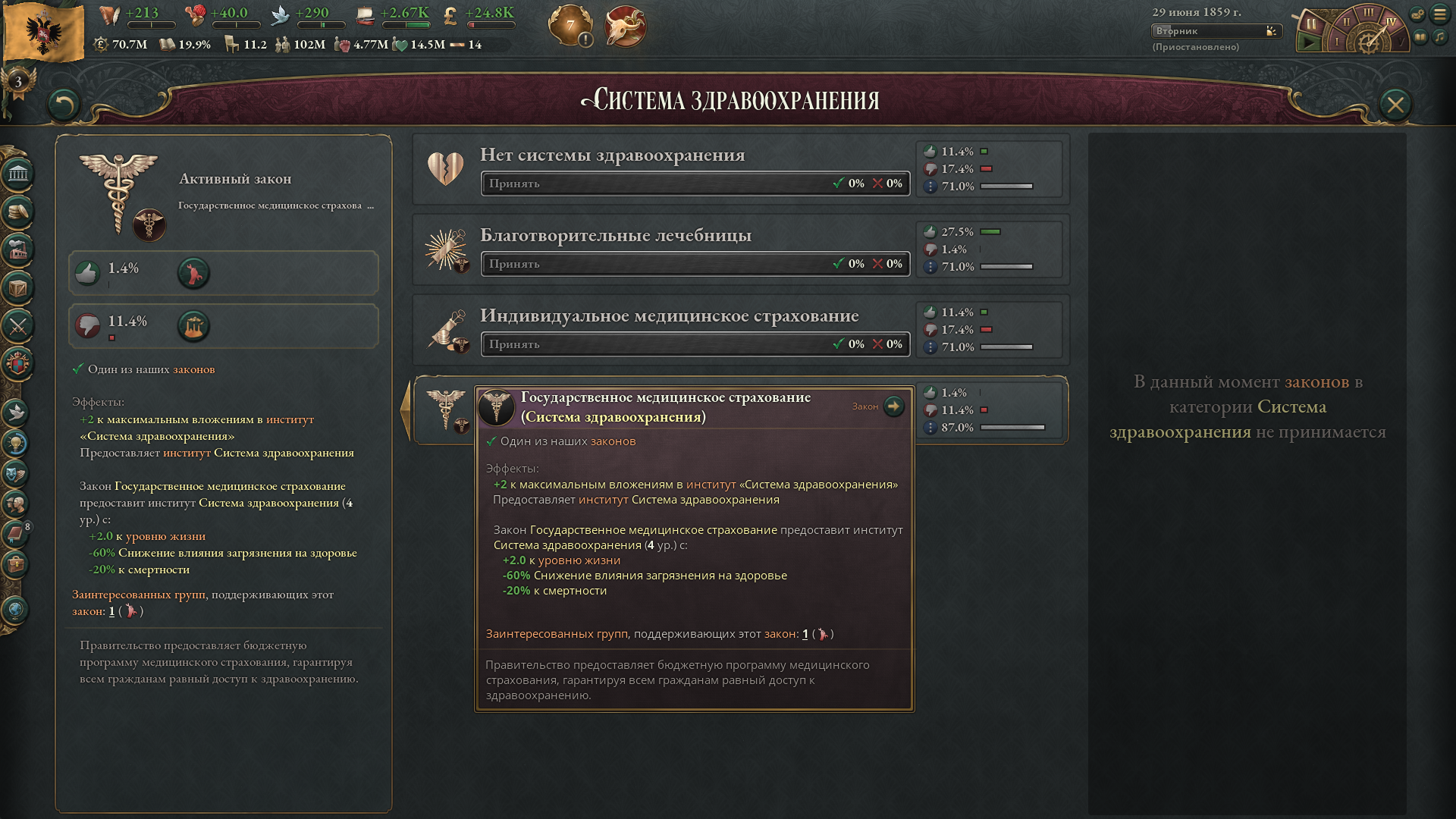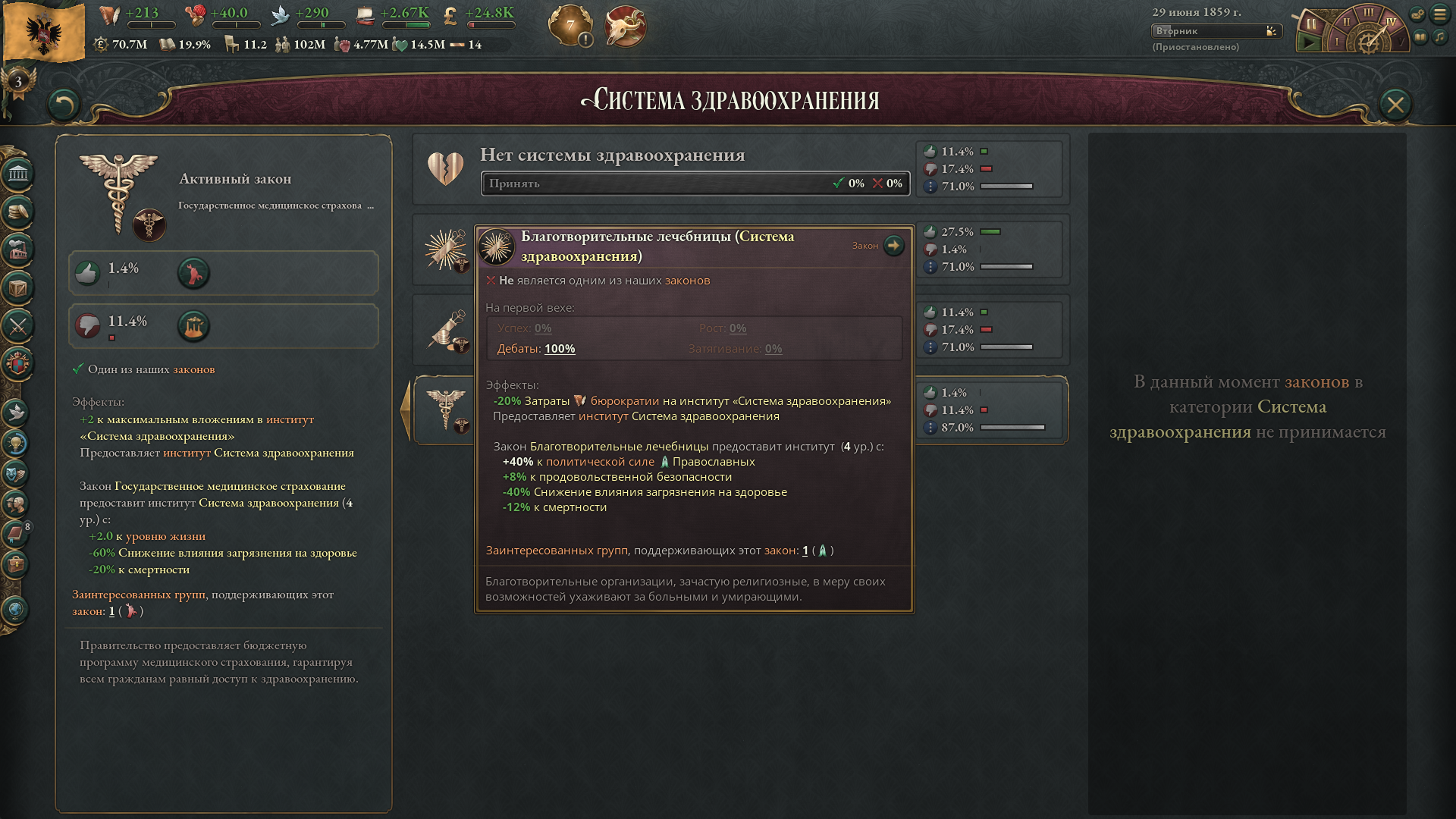 >>50047573 Не забывай еще православных держать в 20 влияния и +10 отношений чтобы еще 5% рождаемости было. И обязательно надо первой техой открывать фармацевтику чтобы брать гос. медицину первым.