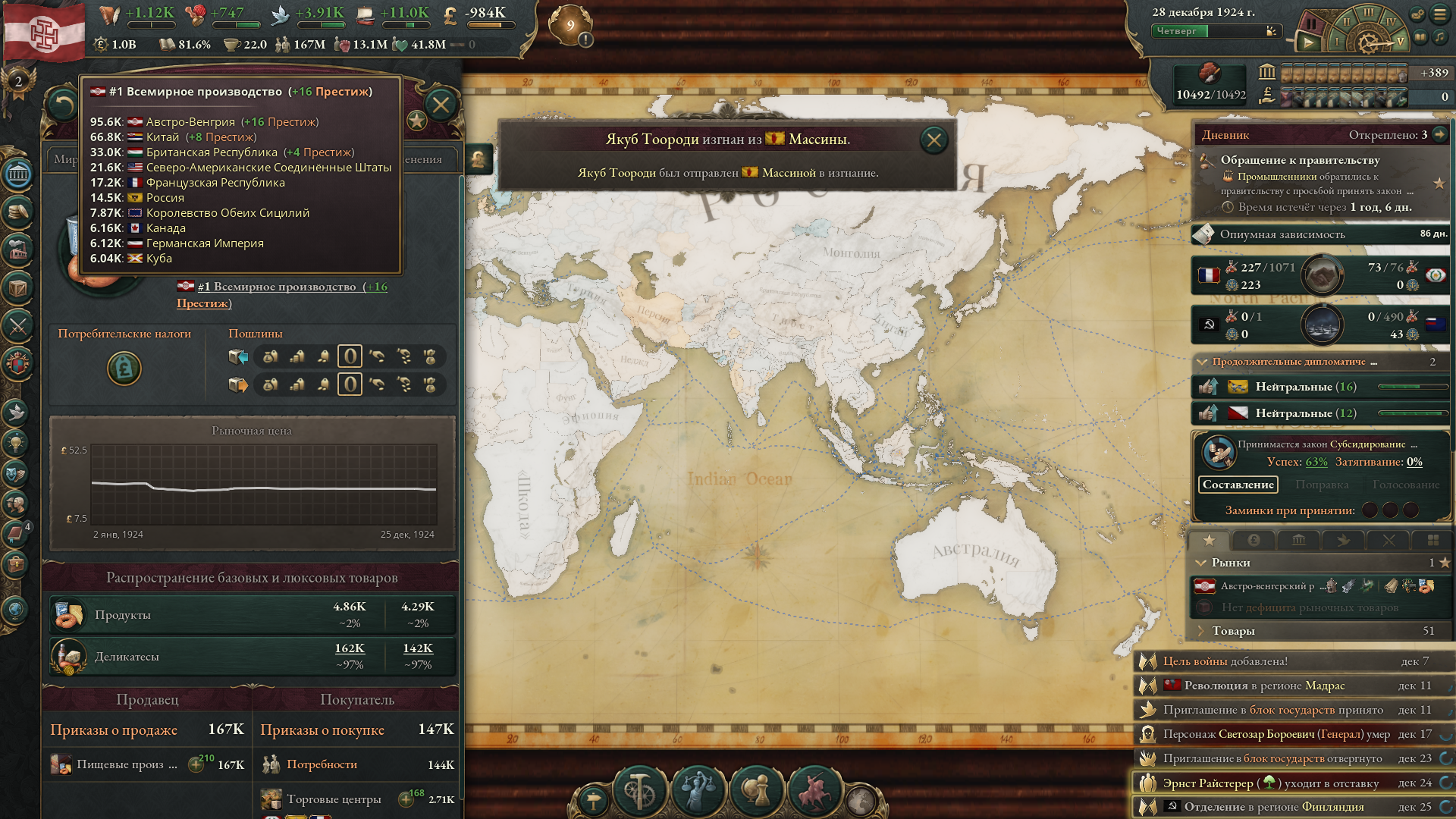 Да, продовольственная компания имба для стран с бедным населением. Она и уровень жизни бафает и продбезопасность, т.е. от голода защищает, рождаемость плюс, и денег нехило приносит. Я ддаже на мировой рынок выйти не могу потому что на внутреннем все скупают и им все мало.