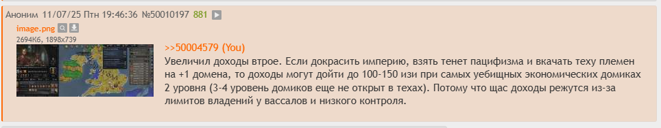 >>50049357 >Чет в сопли Давай начнем с того что было ли у тебя 67 дохода с королевства, получал ли ты 60% доходов с вассала и влияет ли проеб контроля из-за покраса, оверлимит владений вассалов и то что у них не достроены домики? Влияет, следовательно бабки будут х2-3 и это будет пресловутые 150-200 в месяц. Если счиатешь иначе формулу подсчете, довольно простую, я тебе показывал в этом треде.