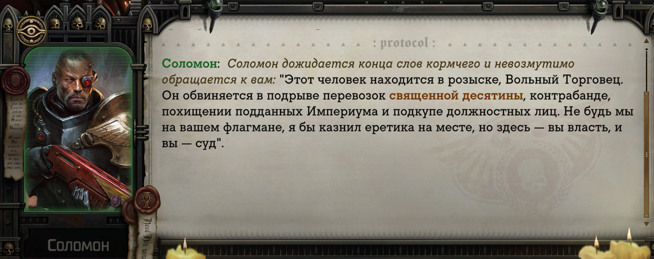 Возьмите на себя роль Вольного Торговца, Лорд-Капитана огромного корабля, и унаследуйте великую реликвию своего рода — Патент Вольного Торговца, подписанный лично Императором.