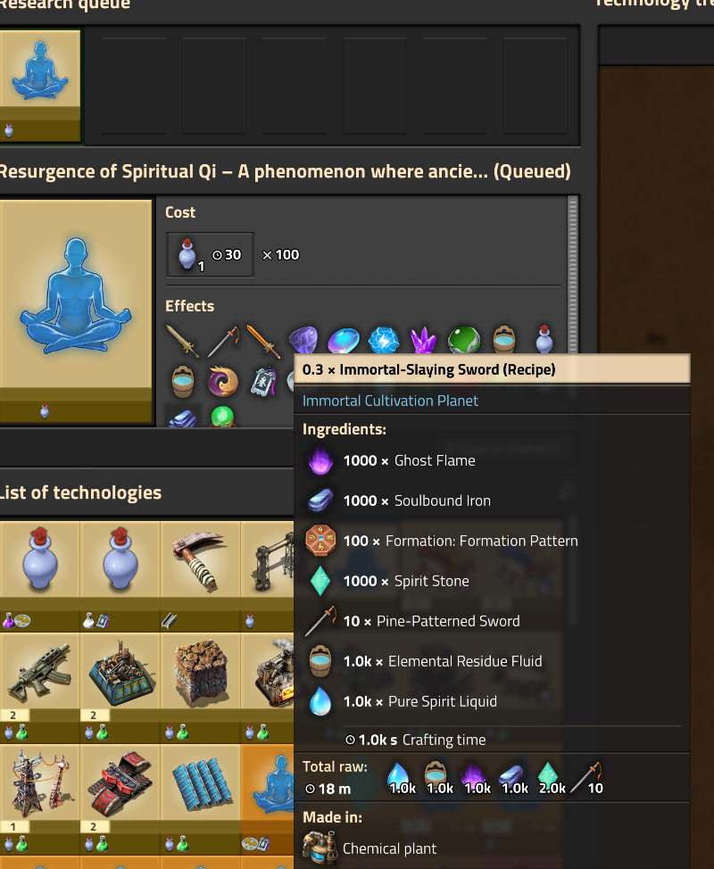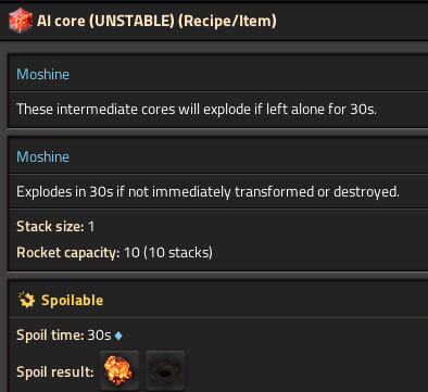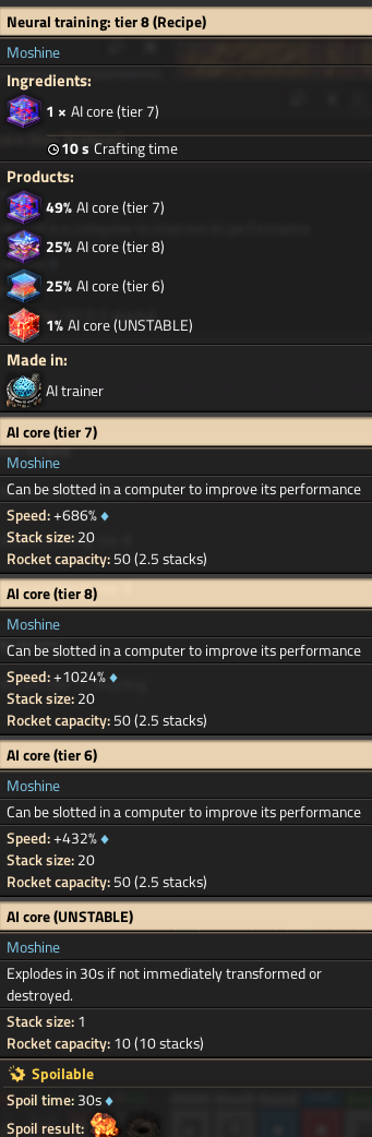 Из новых планет понравился Moshine. Тут есть забавные концепты. Идея планеты в том, что у нее техи учатся в отдельных лабах, и там совсем другой принцип, нежели в ваниле. Тут у тебя теха жрет не условные 5-10-50 тысяч банок, а всего 40 условных "банок". При этом время на один тик может быть 50 тысяч секунд и больше, аи коры 10 левела например изучаются 50 тиков по 730к секунд. Как их тогда изучить с такой длительностью? В домиках есть уникальные модули, аи коры, 10 слотов, и например аи кор 10го уровня дает +2000% спида, т.к. 10 модулей дают +20к%. Коры переупаковываются друг в друга, при этом есть шанс получить нестабильную кору, которая взрывается если ее не стабилизировать за 30 секунд. Плюшки от планеты приятные, лонг ренж стак инсертер, крутой аккум (х4 площадь х60 мощность от обычного), такая же солар панель, очень широкая сабстанция, электропоезда (вместо питания специальные батареи, которые можно перезаряжать), а также рельсы умеют работать как лайтнинг роды фулгоры, я так понимаю от них тоже поезда могут заряжаться. Короче кому хочется нового контента - советую