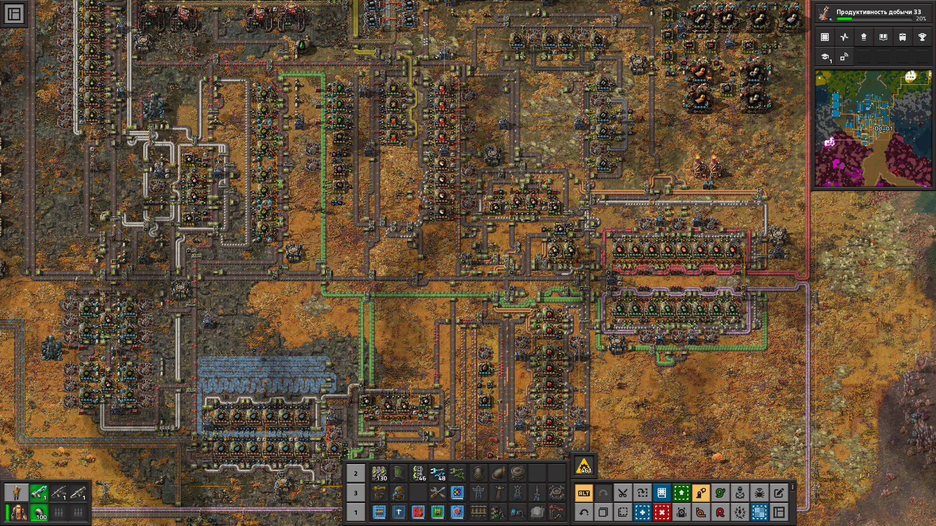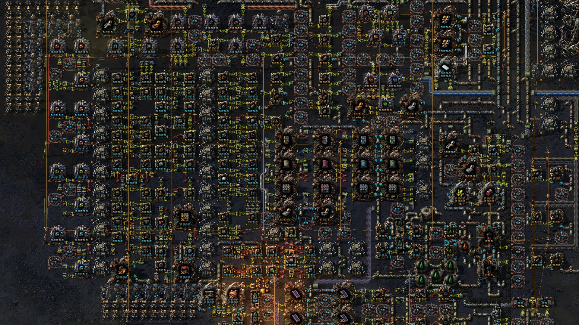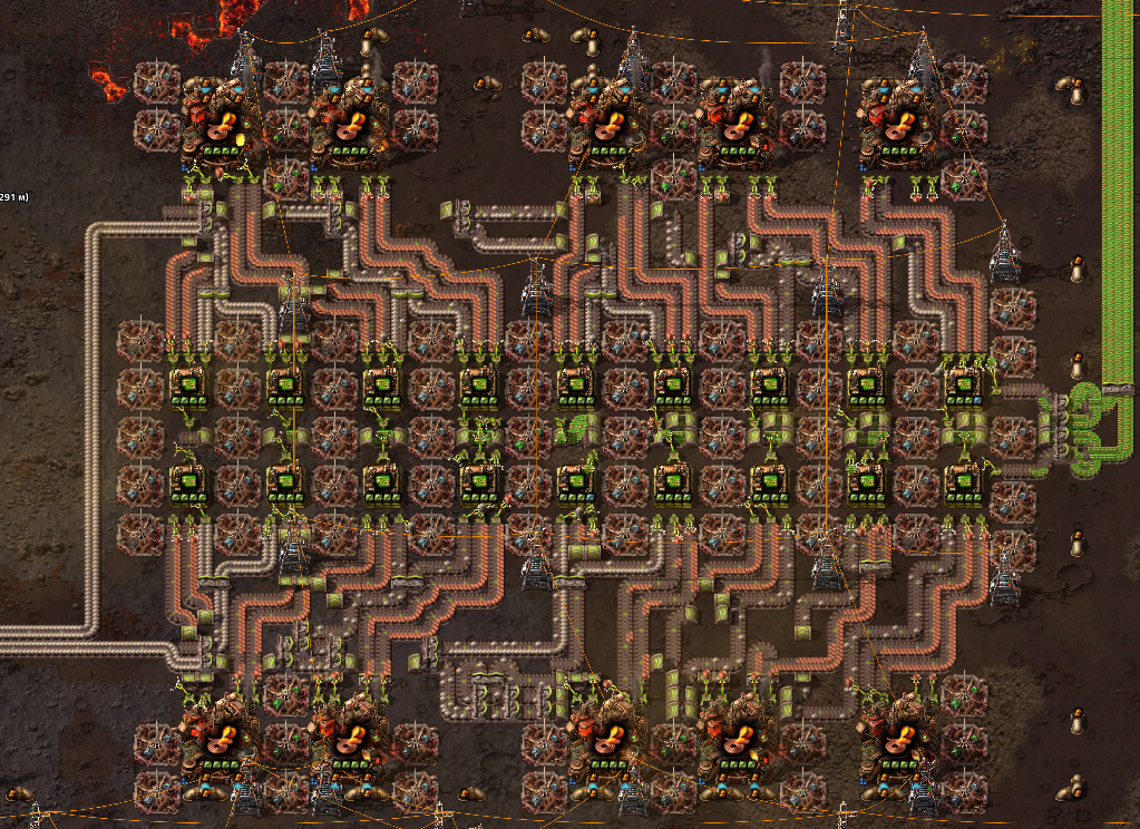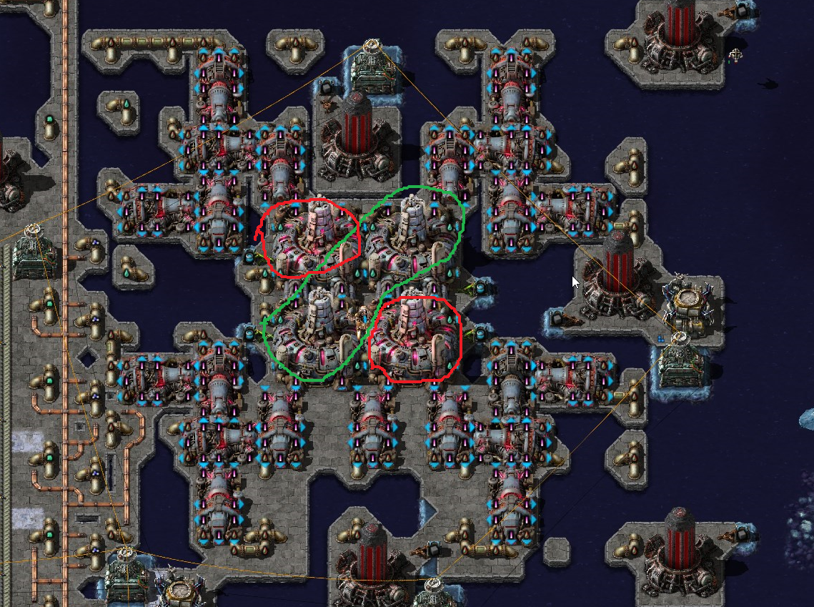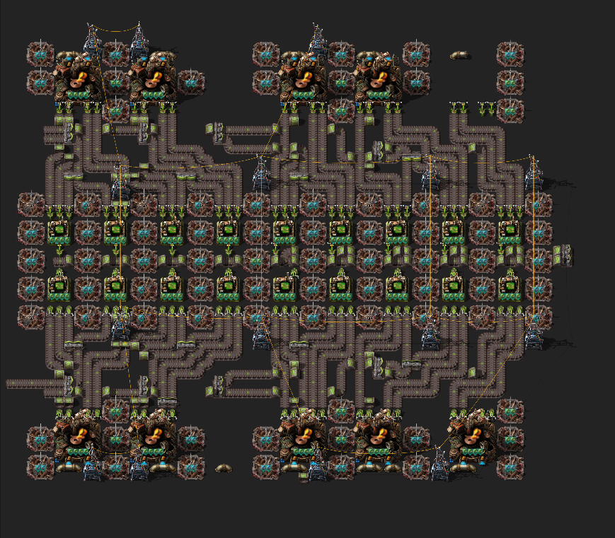 >>49898186 >Но ладно, хоть понятно что фиксить. Чет не замечал, что лапа может засунуть спойледж, если его нет в рецепте. У всяких биофабрик это предусмотрено, чтоб самоочищались. --- Продолжаю пилить фабрику на Глебе; попробовал подавать нечищеные фрукты, чистить по надобности и подавать сразу в сборщики - все нахуй усвистело в сжигатели и забилось биофлюсом (а он не горит, сволочь этакая). Ну тут я дурак, надо было белт с фруктами закольцевать (макароны получились бы ояебу). Подумал, что на белт с конечной точкой в виде печи долгохранящиеся продукты подавать не стоит. Попробовал наоборот - фрукты чистятся централизованно, и по белтам едет пюре, сплиттеры фильтруют гниль, закольцовано все что можно. Вроде работает, но наладить производство бактерий с минимумом лапши непросто.