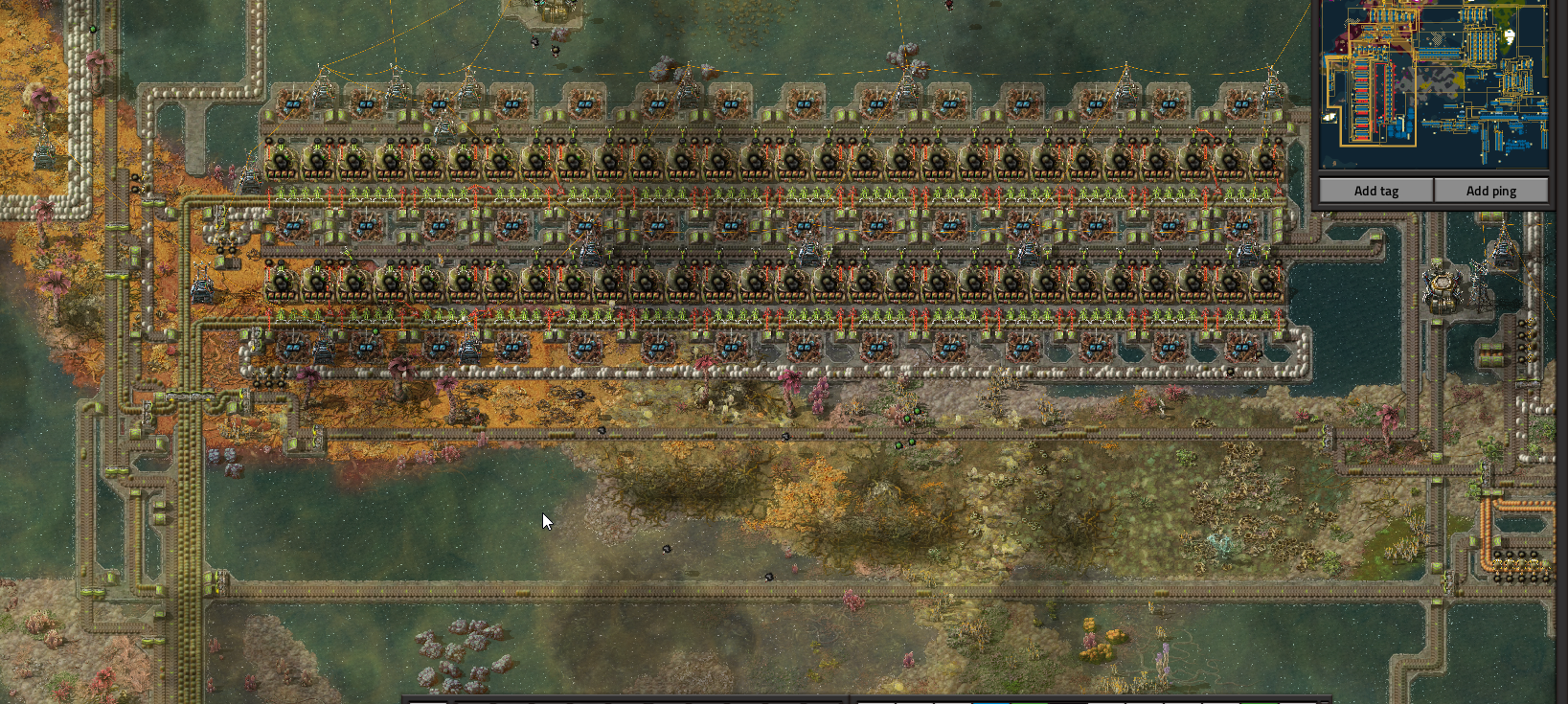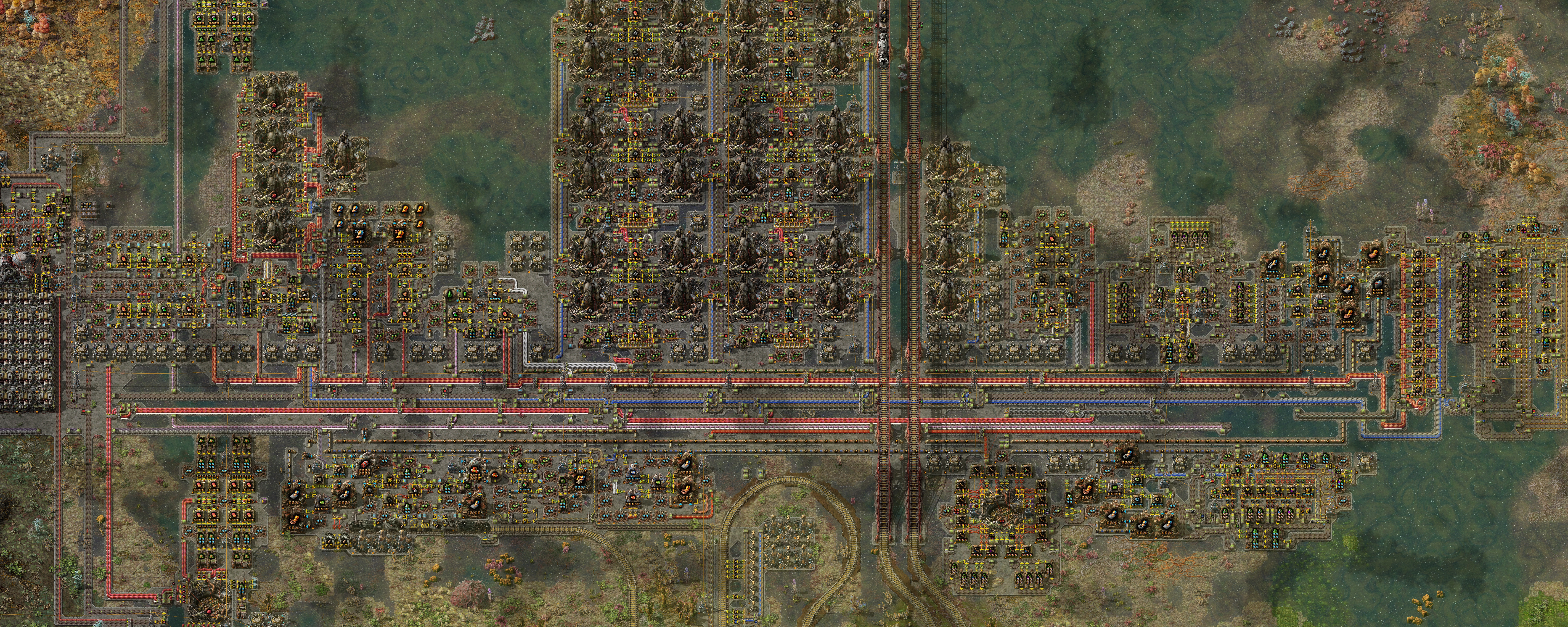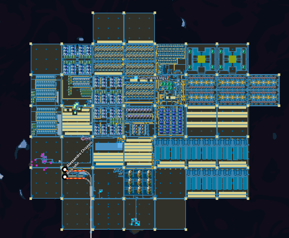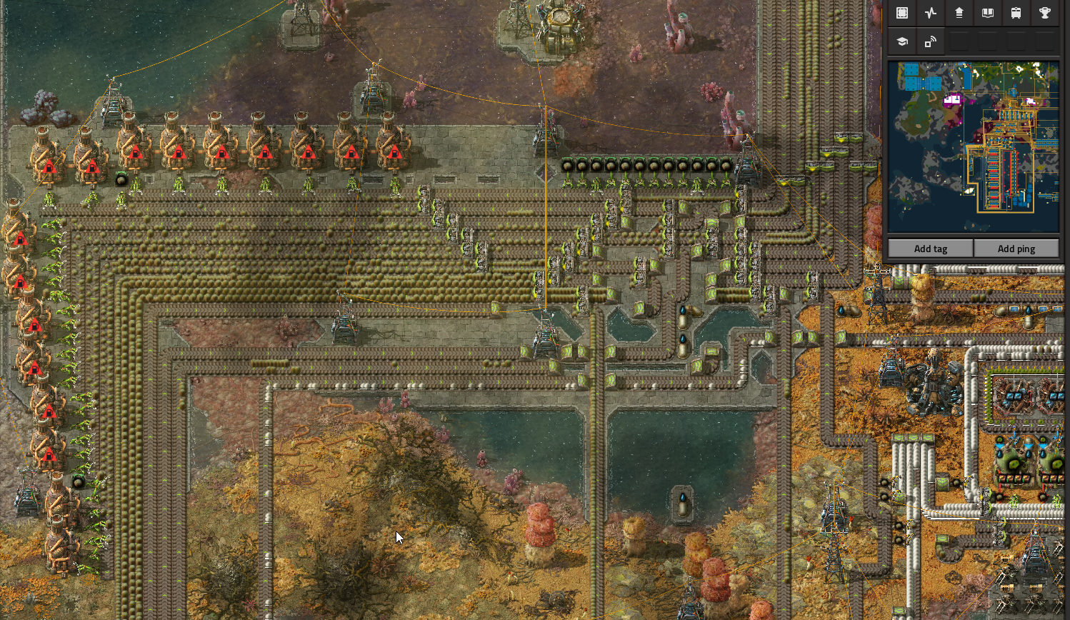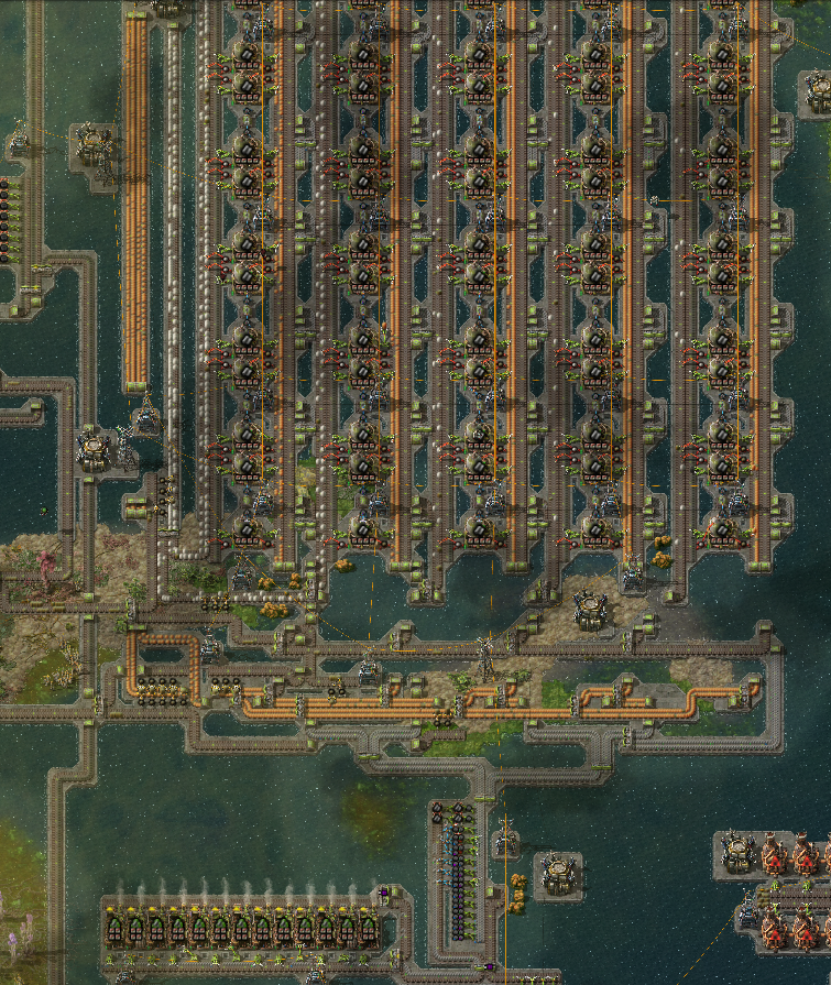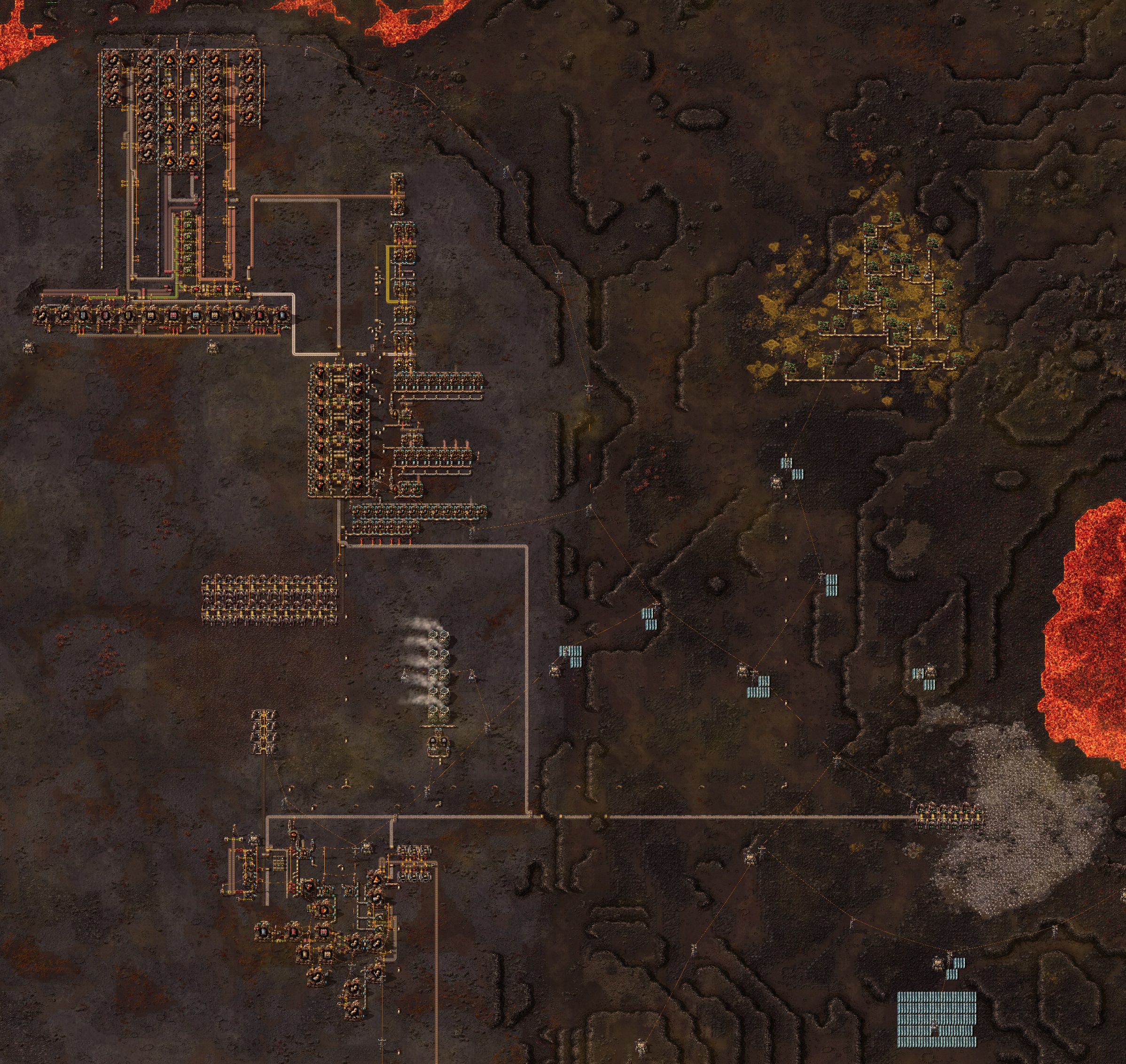>>49898186 >Но ладно, хоть понятно что фиксить. Чет не замечал, что лапа может засунуть спойледж, если его нет в рецепте. У всяких биофабрик это предусмотрено, чтоб самоочищались. --- Продолжаю пилить фабрику на Глебе; попробовал подавать нечищеные фрукты, чистить по надобности и подавать сразу в сборщики - все нахуй усвистело в сжигатели и забилось биофлюсом (а он не горит, сволочь этакая). Ну тут я дурак, надо было белт с фруктами закольцевать (макароны получились бы ояебу). Подумал, что на белт с конечной точкой в виде печи долгохранящиеся продукты подавать не стоит. Попробовал наоборот - фрукты чистятся централизованно, и по белтам едет пюре, сплиттеры фильтруют гниль, закольцовано все что можно. Вроде работает, но наладить производство бактерий с минимумом лапши непросто.
