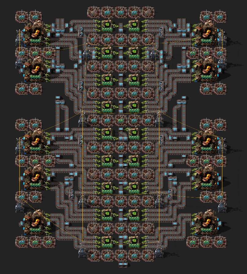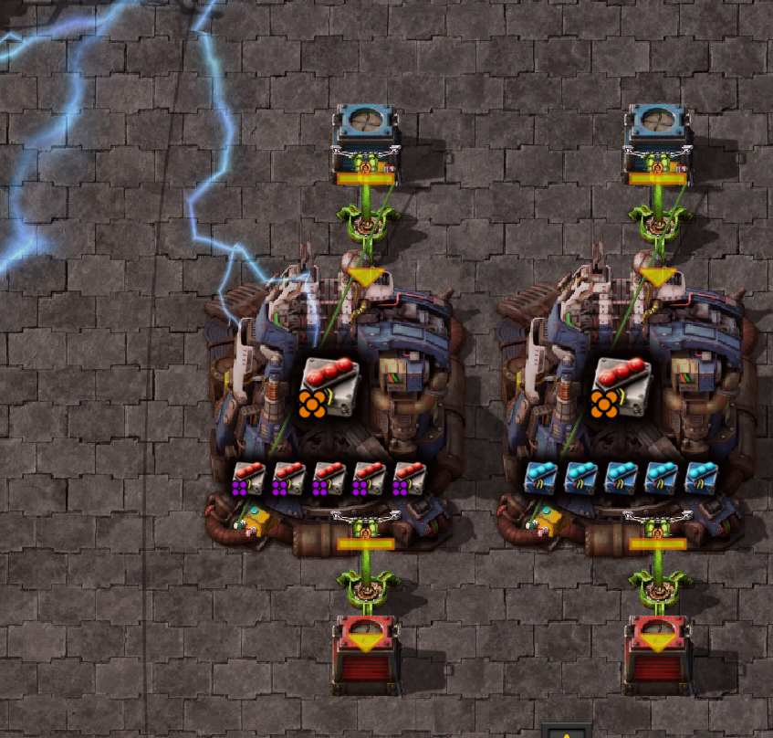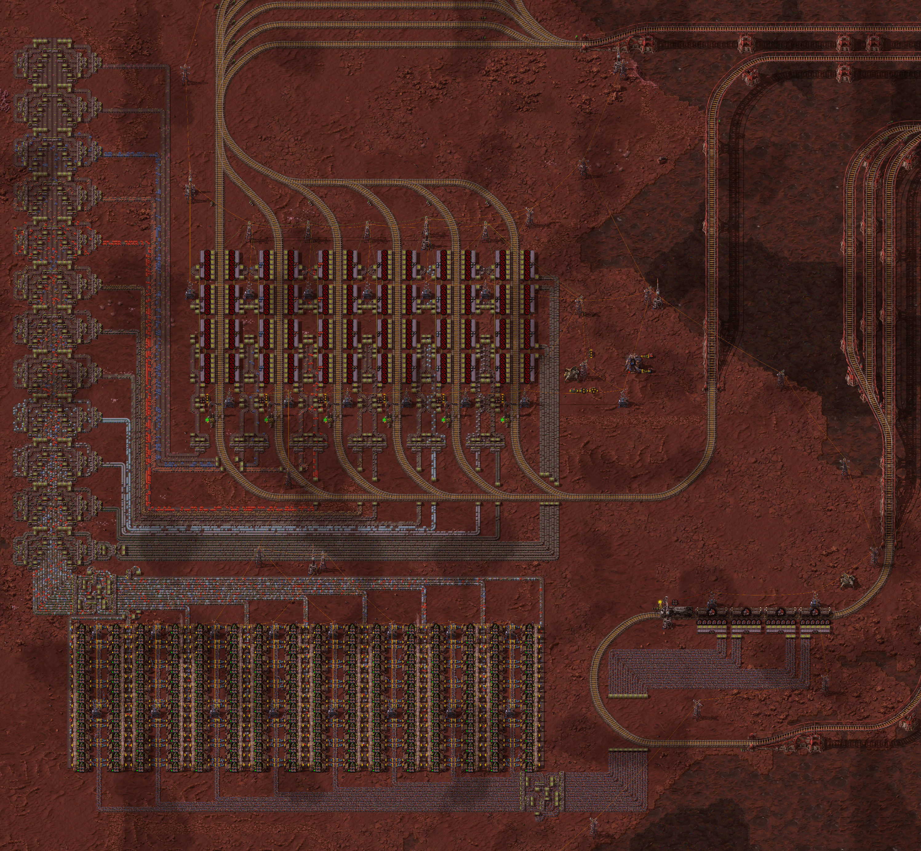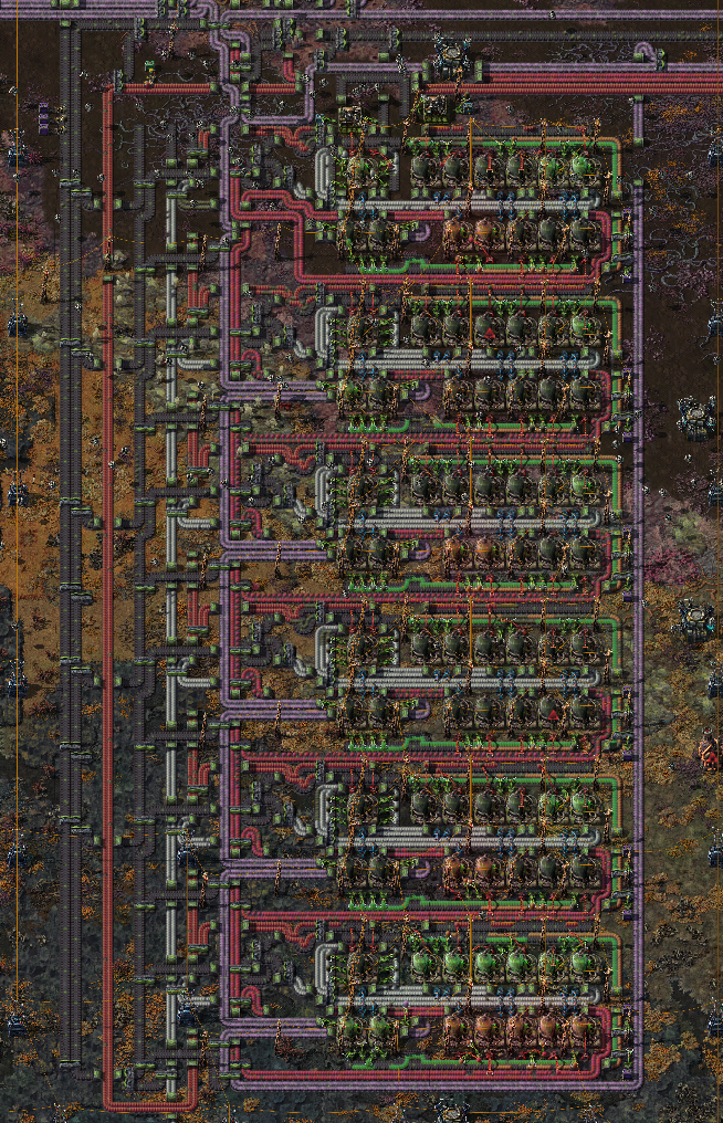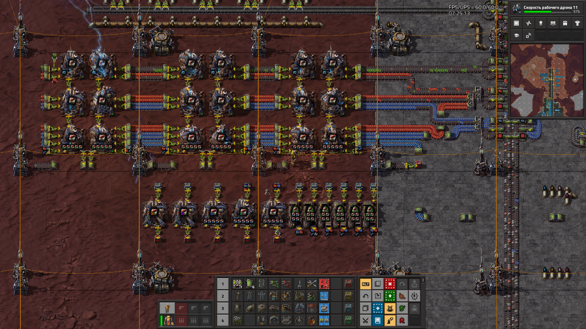 >>49898186 >Но ладно, хоть понятно что фиксить. Чет не замечал, что лапа может засунуть спойледж, если его нет в рецепте. У всяких биофабрик это предусмотрено, чтоб самоочищались. --- Продолжаю пилить фабрику на Глебе; попробовал подавать нечищеные фрукты, чистить по надобности и подавать сразу в сборщики - все нахуй усвистело в сжигатели и забилось биофлюсом (а он не горит, сволочь этакая). Ну тут я дурак, надо было белт с фруктами закольцевать (макароны получились бы ояебу). Подумал, что на белт с конечной точкой в виде печи долгохранящиеся продукты подавать не стоит. Попробовал наоборот - фрукты чистятся централизованно, и по белтам едет пюре, сплиттеры фильтруют гниль, закольцовано все что можно. Вроде работает, но наладить производство бактерий с минимумом лапши непросто.