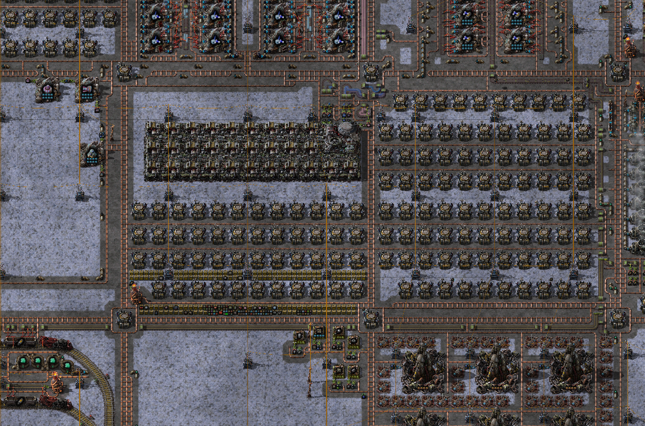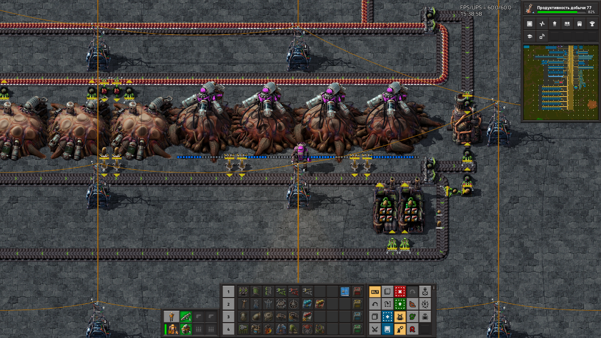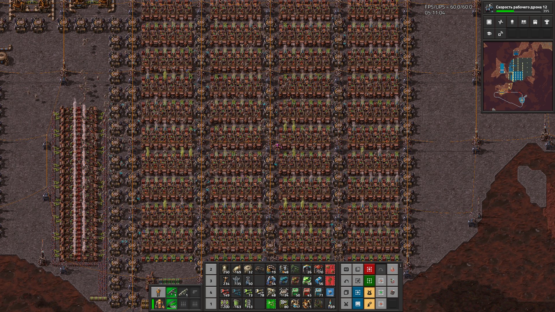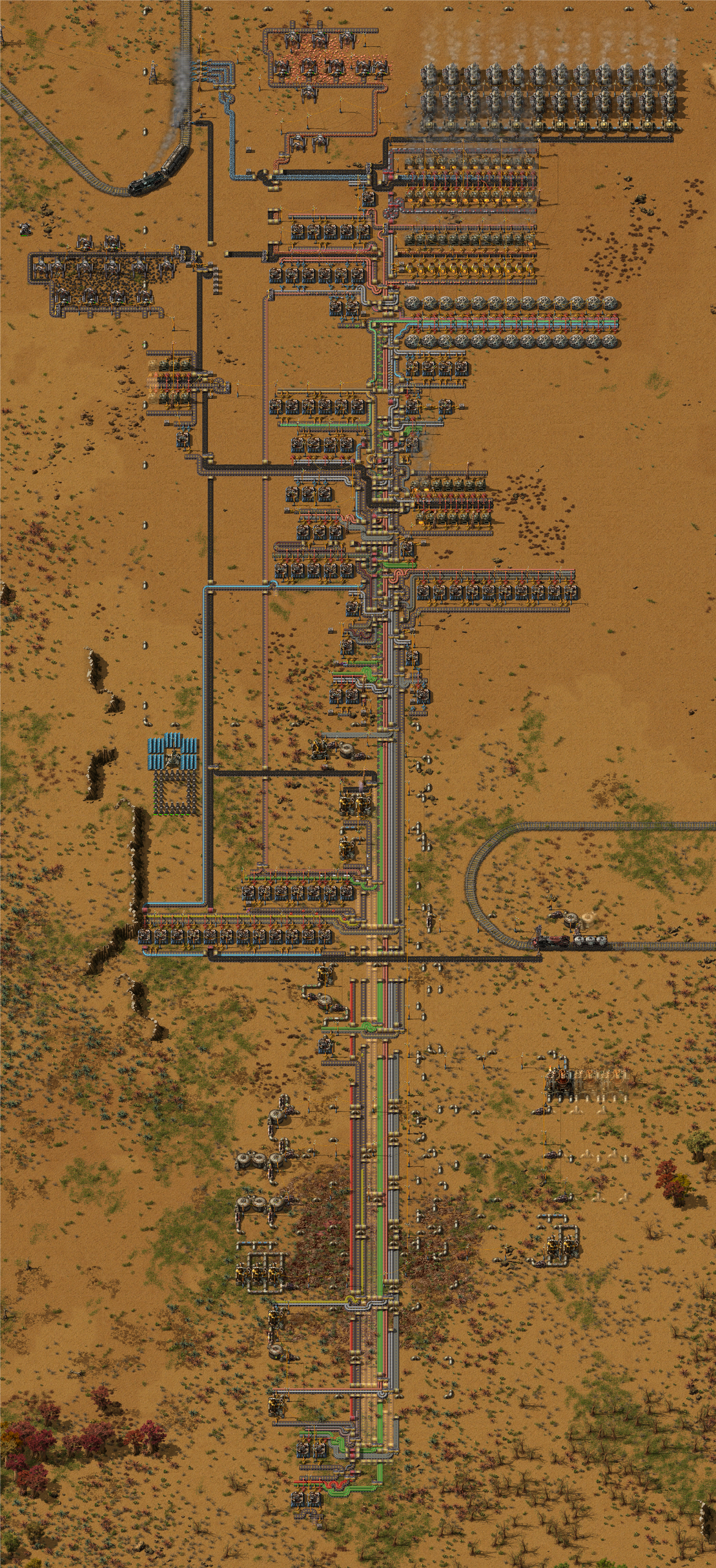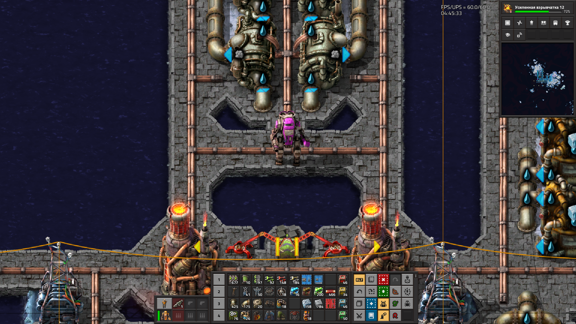 >>49898186 >Но ладно, хоть понятно что фиксить. Чет не замечал, что лапа может засунуть спойледж, если его нет в рецепте. У всяких биофабрик это предусмотрено, чтоб самоочищались. --- Продолжаю пилить фабрику на Глебе; попробовал подавать нечищеные фрукты, чистить по надобности и подавать сразу в сборщики - все нахуй усвистело в сжигатели и забилось биофлюсом (а он не горит, сволочь этакая). Ну тут я дурак, надо было белт с фруктами закольцевать (макароны получились бы ояебу). Подумал, что на белт с конечной точкой в виде печи долгохранящиеся продукты подавать не стоит. Попробовал наоборот - фрукты чистятся централизованно, и по белтам едет пюре, сплиттеры фильтруют гниль, закольцовано все что можно. Вроде работает, но наладить производство бактерий с минимумом лапши непросто.