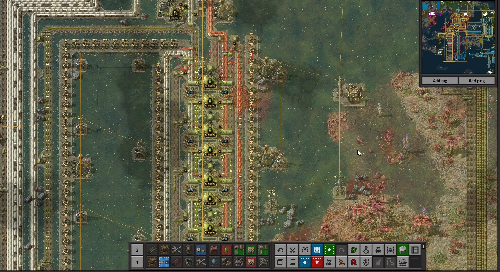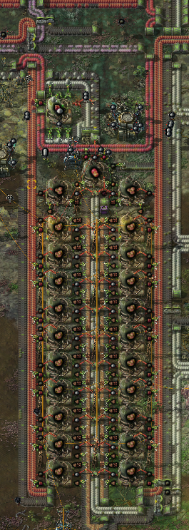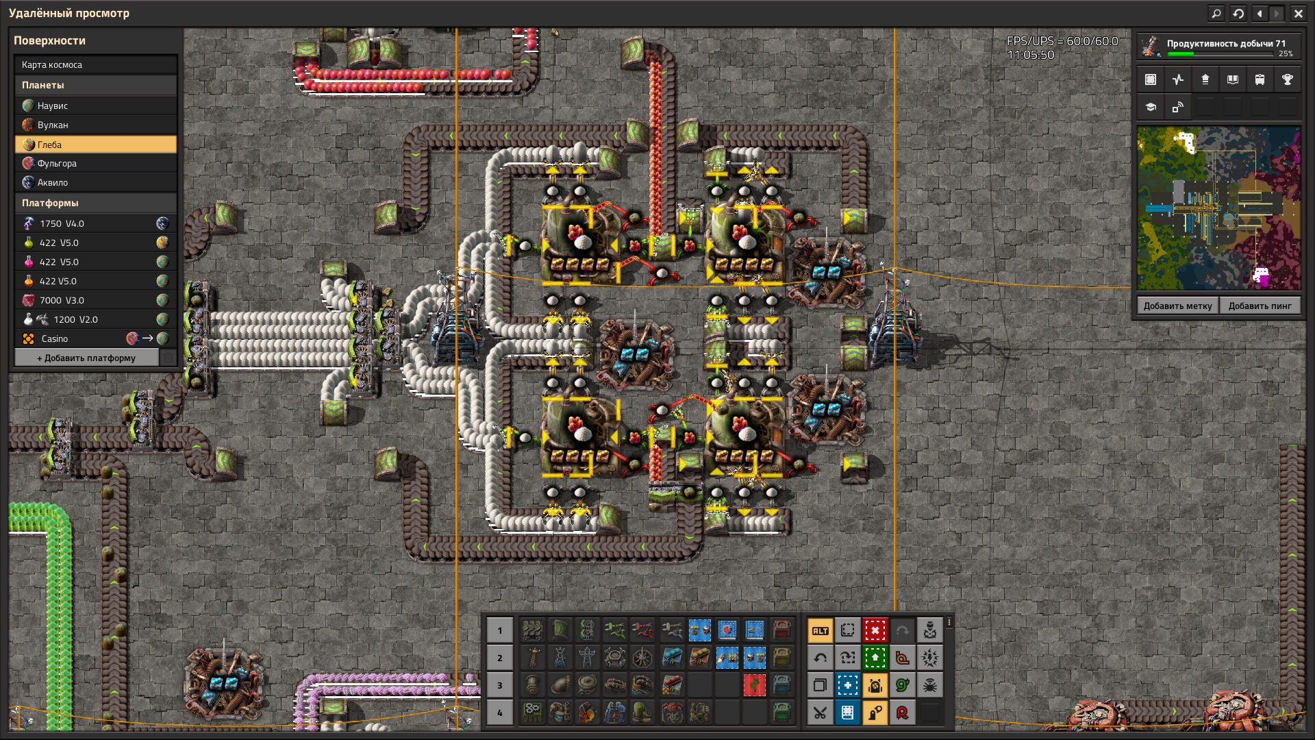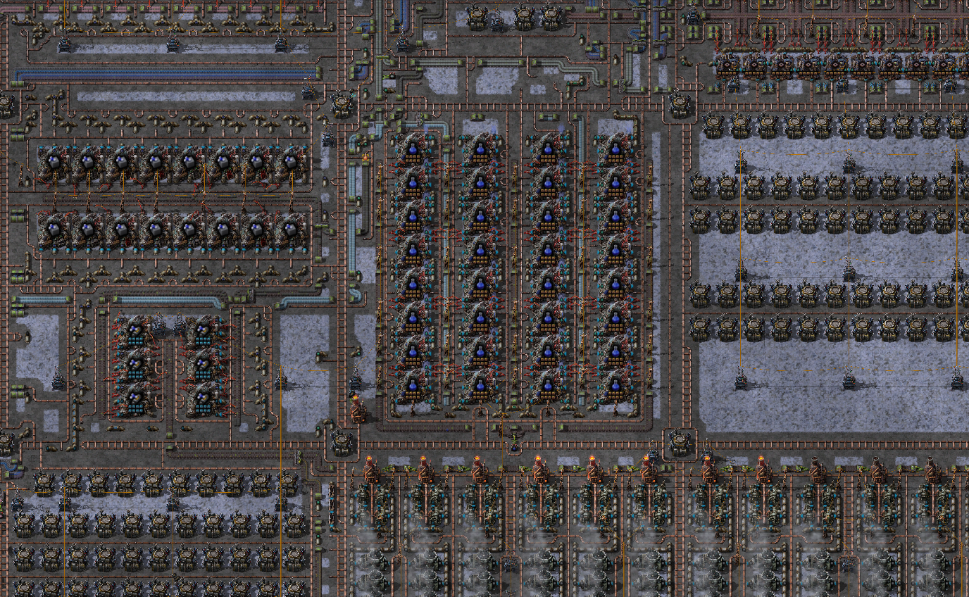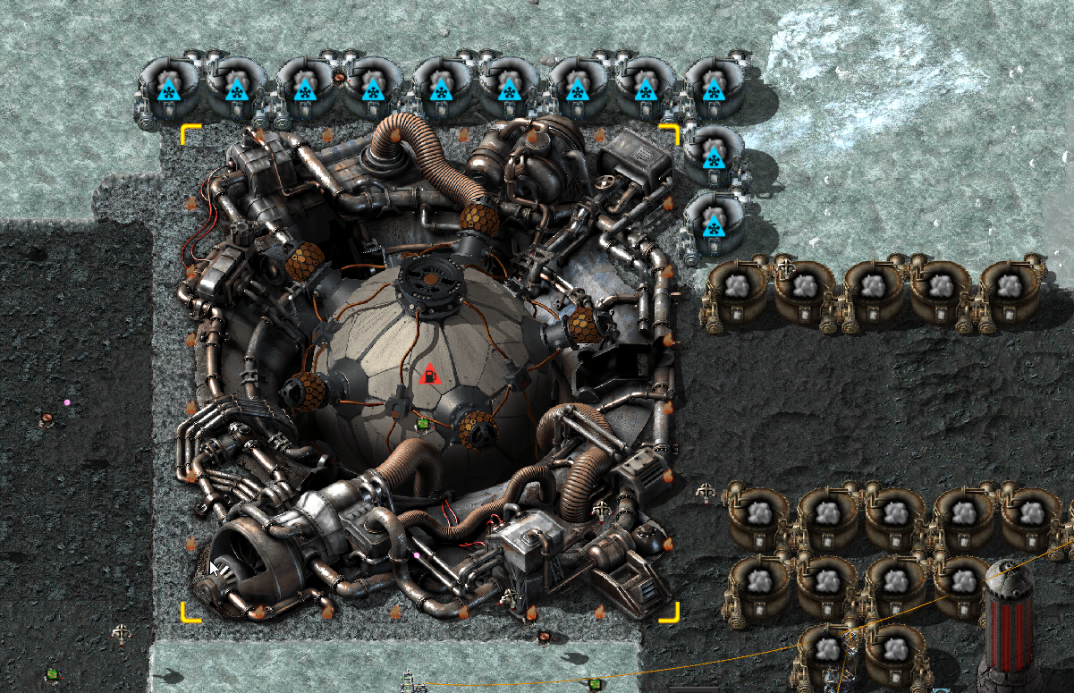 >>49898186 >Но ладно, хоть понятно что фиксить. Чет не замечал, что лапа может засунуть спойледж, если его нет в рецепте. У всяких биофабрик это предусмотрено, чтоб самоочищались. --- Продолжаю пилить фабрику на Глебе; попробовал подавать нечищеные фрукты, чистить по надобности и подавать сразу в сборщики - все нахуй усвистело в сжигатели и забилось биофлюсом (а он не горит, сволочь этакая). Ну тут я дурак, надо было белт с фруктами закольцевать (макароны получились бы ояебу). Подумал, что на белт с конечной точкой в виде печи долгохранящиеся продукты подавать не стоит. Попробовал наоборот - фрукты чистятся централизованно, и по белтам едет пюре, сплиттеры фильтруют гниль, закольцовано все что можно. Вроде работает, но наладить производство бактерий с минимумом лапши непросто.