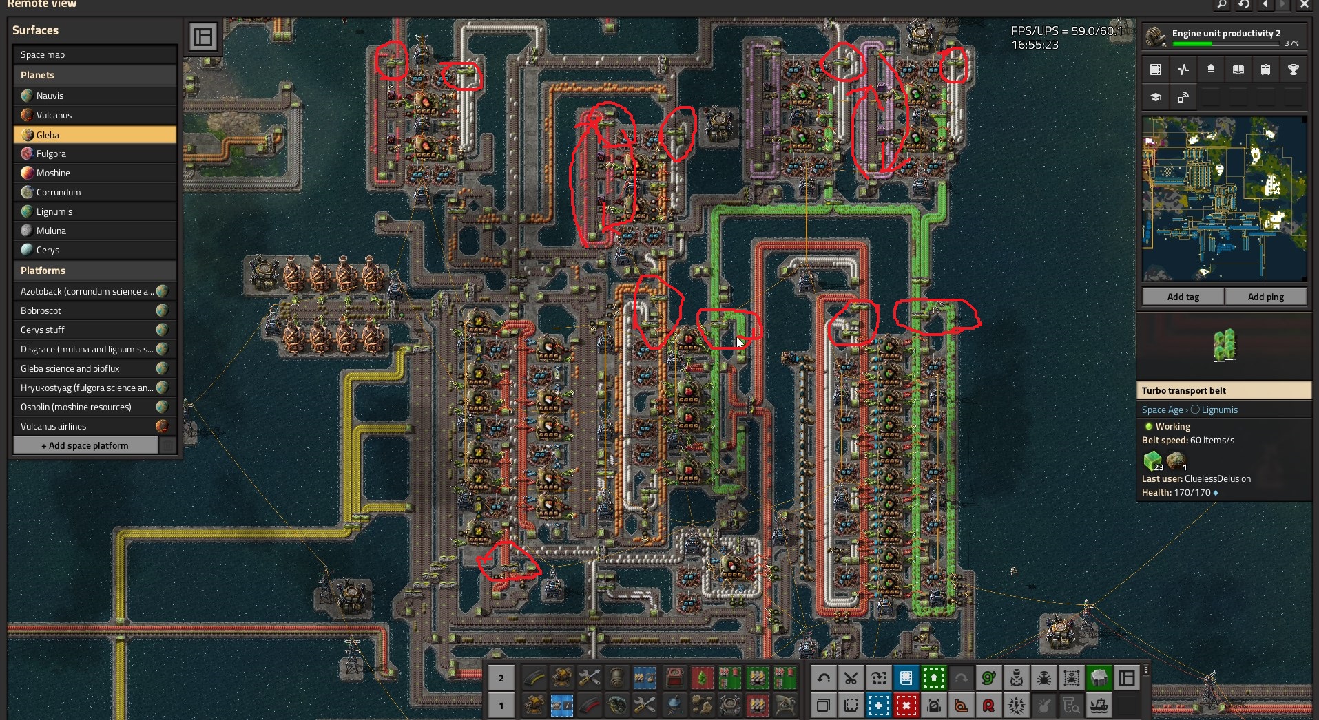 >>49918386 Ну главное, к чему я пришел на глебе - всё должно ездить по кругу. Каждый мини-блок с портящимися вещами должен закольцовываться. Выделил на скринах красненьким то, о чем я говорю. Это сразу решает половину проблем, если не больше. Во-первых вещи меньше застаиваются на бельтах, "предлагают себя" разным домикам и так чуть-чуть оптимизируется расход. Во-вторых, что даже важнее, во время этой бесконечной карусели очень удобно снимать с бельтов спойледж и отправлять его по своим изолированным бельтам на сжигание/переработку в карбон.