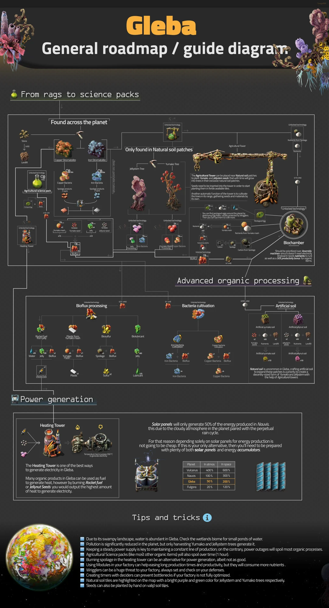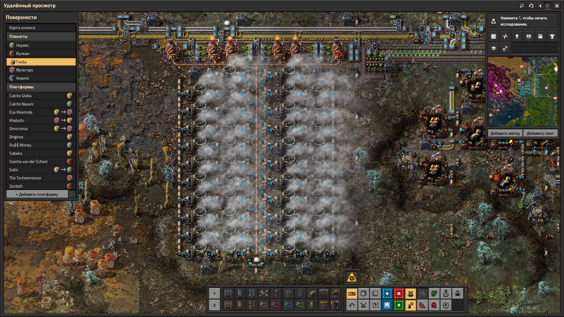 И еще хз как люди делают Глебу первой планетой. Т.е. я примерно представляю, как, но для того, чтоб автоматизированно получать металлы, надо белты к фермам пустить, биокамеры расставить, производство наладить и главное, чтоб оно все непрерывно работало, иначе забивается мгновенно. И для того, чтоб все организовать, нужна техника из металлов, которые самый основной из основных ресурсов. Это пиздец интересно и весело (без иронии), но с голой жопой придется вручную строматолиты в штанах носить. Для сравнения, на Наувисе надо просто тыкнуть бур, на Вулкане - носить ровно до первой плавильни, на Фульгоре - воткнуть переработчик.