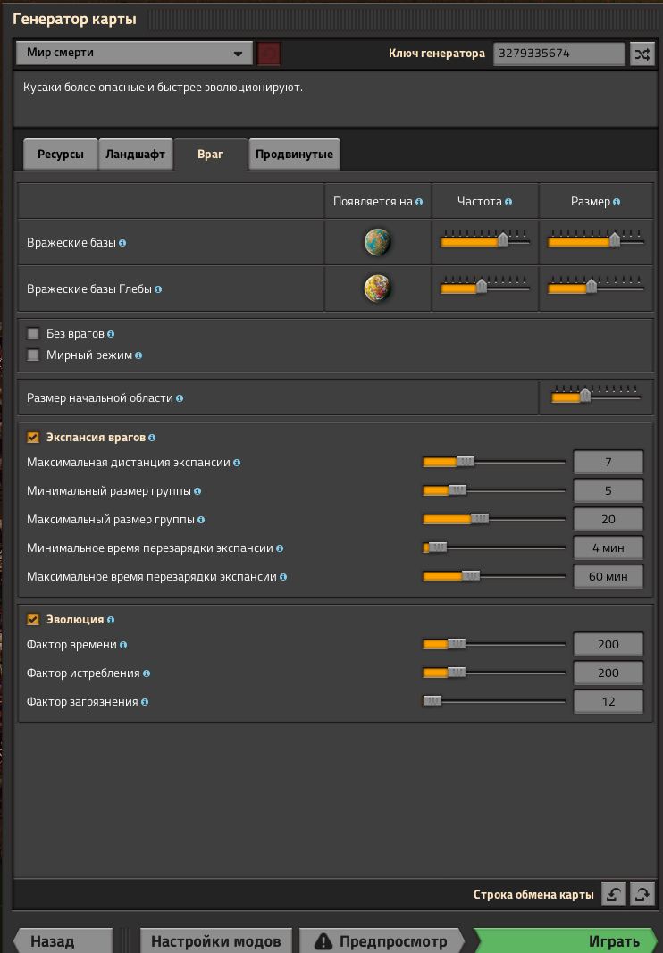 >>49907714 Я бы хотел посмотреть более поздние стадии игры, которые не показаны в обучении, но плохо представляю как скейлятся враги. Так что тут скорее вопрос какие параметры задать чтобы меня не переехали по незнанию через пару часов игры. Тип вот этот фактор эволюции от времени и уничтожения гнёзд насколько влияет?