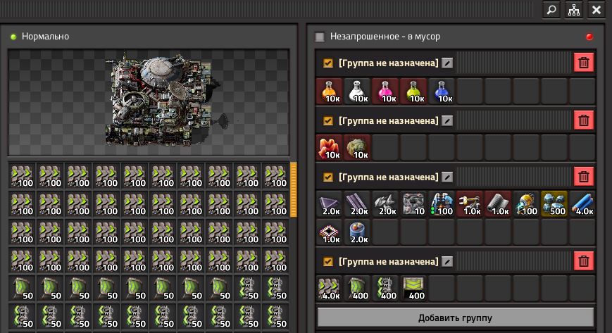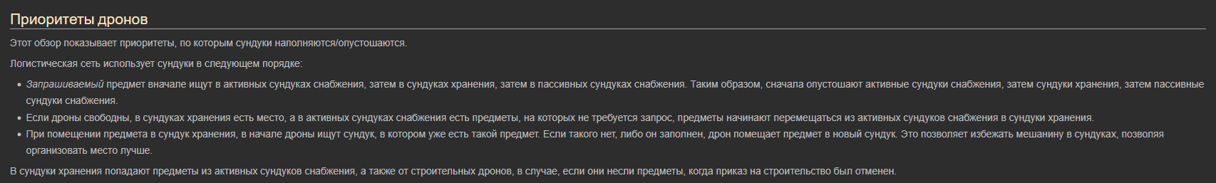 >>50036211 меняем синий сундук на выходе производства на фиолетовый. дроны всегда забирают из него в желтый а из желтого в синий приоритетней красного. в результате эти 10 бочек катаются по кругу без переполнения. конкретно я юзал фиолетовые на фульгоре для сортировки мусора и отправки лишнего в повторную переработку на красных/синих во первых надо выставлять настройки каждого синиего сундука по правильным рейтам иначе все станет потому что условная медная проволока не успевает перерабатываться так как поставил под неё недостаточно рециклеров, во-вторых так как у сниих сундуков приоритет одинаковый часть нужных материалов улетит в повторную переработку а не туда где нужно. желтый > рециклер > фиолетовый это все решает. просто лепи еще блок когда не хватает, дроны сами разберутся что куда носить