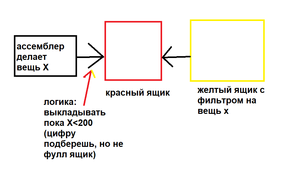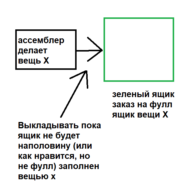>>50033922 в лишних бочках. положим у тебя процесс который жрет 10 бочек и отдает 10 бочек. плюс у тебя ассемблер делает 10 бочек. ставишь везде красные сундуки и синий на прием. в синий носит поровну из обох красных сундуков первый цикл - взяли 10 бочек с ассемблера положили в сундук они отработали получили 10 пустых бочек второй цикл - взяли 5 бочек с ассемблера и 5 из производства. получили 15 пустых бочек. и так цикл за циклом у нас будут копится по 5 бочек до тех пор пока сундук не заполнится и процесс встанет потому что некуда сгружать бочки. синие/красные это разрулить не могут. добавление фиолетового и желтого - может