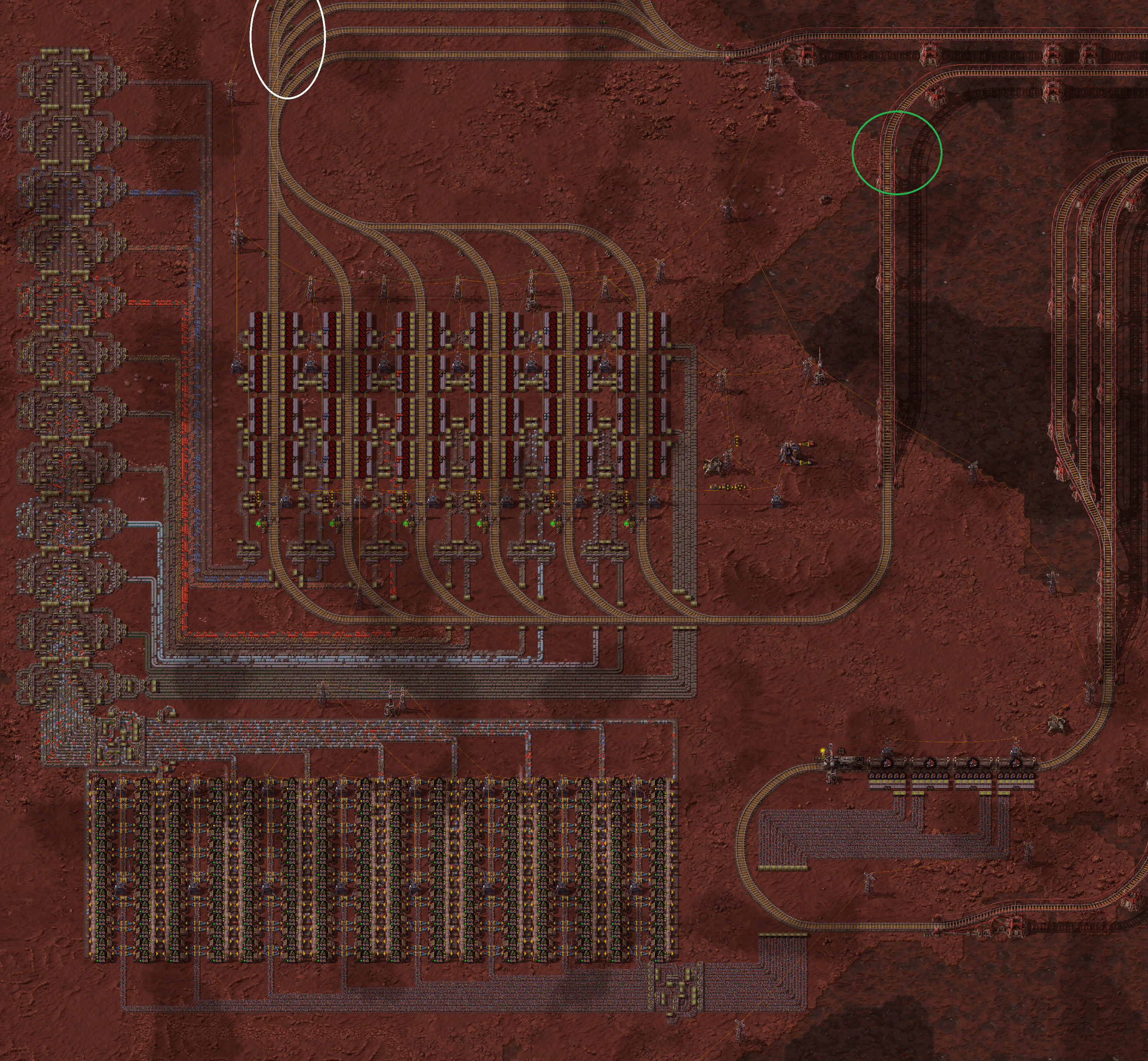 >>50064892 >>50064044 Там поезда сверху заезжают. И на выезде там есть светофор (зеленый кружок) Кстати, вроде бы там где я обвел белым кружком лучше поставить проходные светофоры - это позволит поездам чуть быстрее заезжать на станции в некоторых ситуациях