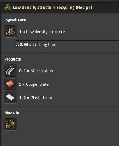 >>50065141 >объемы выше и проще Я хз, у меня один орбитальный казик с ~300 дробилками закрыл вообще вопрос с легендарным железом\медью. Фишка дробилки астероида в том, что она возвращает 80% ресурса за цикл, а рекуклер только 25%. А чтоб надрочить легенду нужно 4 шага. Дробилка: 0.80.80.8*0.8 = 0.4 Рекуклер: 0.25 = 0.004 Разница на 2 порядка. Да, в рекуклер влазит 4 модуля качества, а не 2, но это не сильно меняет картину. Я ваще пришел к выводу, что засовывать т3 легендарные модули качества в рекуклеры, сгрызающие мусор на фульгоре - это бесполезная хуита. Пытаешься надрочить качество у всего сразу и по итогу легендарки в следовых количествах выходят. Даже ебаная качественная гольмиевая руда по-факту бесполезна, т.к. пластины делаются из жидкости. По итогу делаю так: - железо и медь с орбитального казика - гольмиевые пластины кручу на фульгоре через вулканские литейки + рекуклеры - уголь добываю на вулкане гигабурами с модулями качества + рекуклинг. Получаю легендарный уголь -> легендарный пластик и углерод -> легендарные лдс - легендарную вольфрамовую руду кручу по той же схеме, из неё получаю легендарные вольфрам балки + легендарный карбит вольфрама Щас думаю как легендарное углеволокно делать, походу нужно крутить пюрешку на глебе. После получения легендарного углеволокна по-сути вопрос с компонентами для любой хуйни закрывается.