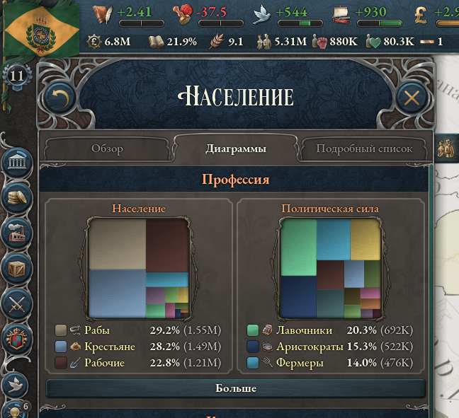 Лень доигрывать. Все техи открыты, занятость 100%, в сх минимум, а ввп на душу в лучшее время прыгал до 10.5 при полной занятости промки. Как до 11 добить хз. Уровень жизни доходил до 30.5, но я начал войну, провел мобку на 200к и население видимо в птср ушло и обратно не хочет подыматься, хотя налоги и все прочее не поменялось нихуя.