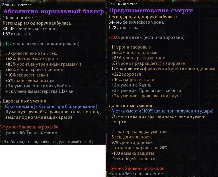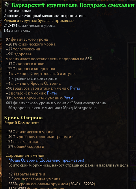 Не знаю, один это анон отвечает или несколько, но спасибо большое. Апнул 94, где колотуху взять двуручную на физу+травму? Играю через скипетр Олерона, нужно дробящее. Пока что ничего лучше дубины с Волдрака в перевале контрабандистов не нашел, периодически его фармлю чтобы выбивать палку со статами получше. А че еще есть годное из пушек?