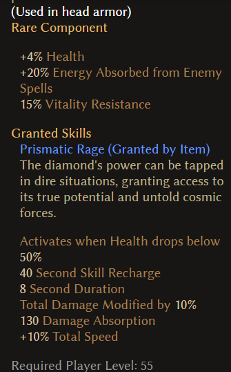>>49754357 У трикстера много брони, но поглощение остается на 70%, увеличь его вот этим компонентом https://www.grimtools.com/db/items/2867 Судя по ветеркам и духам, урон у тебя элементальный, и эксклюзив ультоса, а не могдрогена - у последнего хотя бы поглощение урона есть. Так что вкачивайся в реген в навыках и созвездиях.