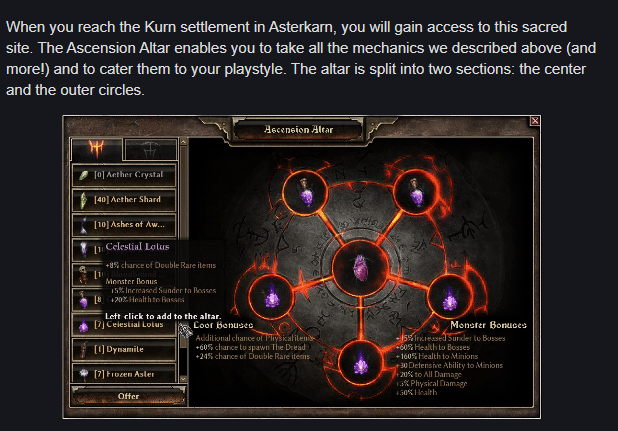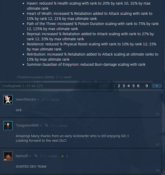 Вышла версия 1.2.0.0, которая довольно значительно перелопатила механики игры. Из значимого: 1) Ауры, постоянные баффы и эксклюзивные скиллы активируются автоматически. Механика нулификации переделана, и теперь только отключает баффы на время, после чего они автоматически включаются. 2) Также на нормале и элите уровень локаций (и соответственно мобов) теперь скейлится вплоть до 100 уровня. 3) После убийства Логхоррена на Нормале открываются сразу и сложность Элита, и Ультимейт. 4) Награды за квесты с очками скиллов\характеристик выдаются сразу за все предыдущие сложности - больше не нужно бегать их выполнять заново на Нормал\Элитку. 5) Добавили стандартный дэш персонажу, по умолчанию поставлен на пробел. Старым персонажам нужно задать кнопку вручную в настройках. 6) У большинства (но не у всех!) мобов и боссов убрали абилки и атаки со снижением резистов, и заменили их дебаффом Sunder - тупо увеличивает весь входящий по игроку урон в % на определенное время.