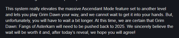 Анонсировано новое ДЛС - Fangs of Asterkarn! Заявленные ключевые фичи (оппик №2): 1) Новый игровой режим - Ascendant Game Mode: что-то типа режима "ветеран", но для сложности ультимейт 2) 10 мастерство - "берсерк": может трансформироваться в зверя, будут доступны две звериные формы, специализируется на холоде и кровотечении. 3) Новая игровая зона - Астеркарн, расположена на севере. 4) Кастомизация зелий - подбор ингредиентов, выбор сосуда и два слота под зелья 5) Трансмутация аффиксов на предметах 6) Расширение Горнила - +30 новых волн (новая максимальная волна будет 200 вместо 170 как сейчас), новый лут. 7) Расширение Шардов: добыча теперь будет падать вплоть до 90 шарда, а не до 75-76, также будут новые арены с боссами 8) Сотни новых предметов, также новая MI-зеленка для новых и даже старых мобов 9) Пробужденные эпические (синие) предметы - можно превращать эпики в легендарки 10) Две новые фракции. Релиз - обещают где-то в 2024 году.