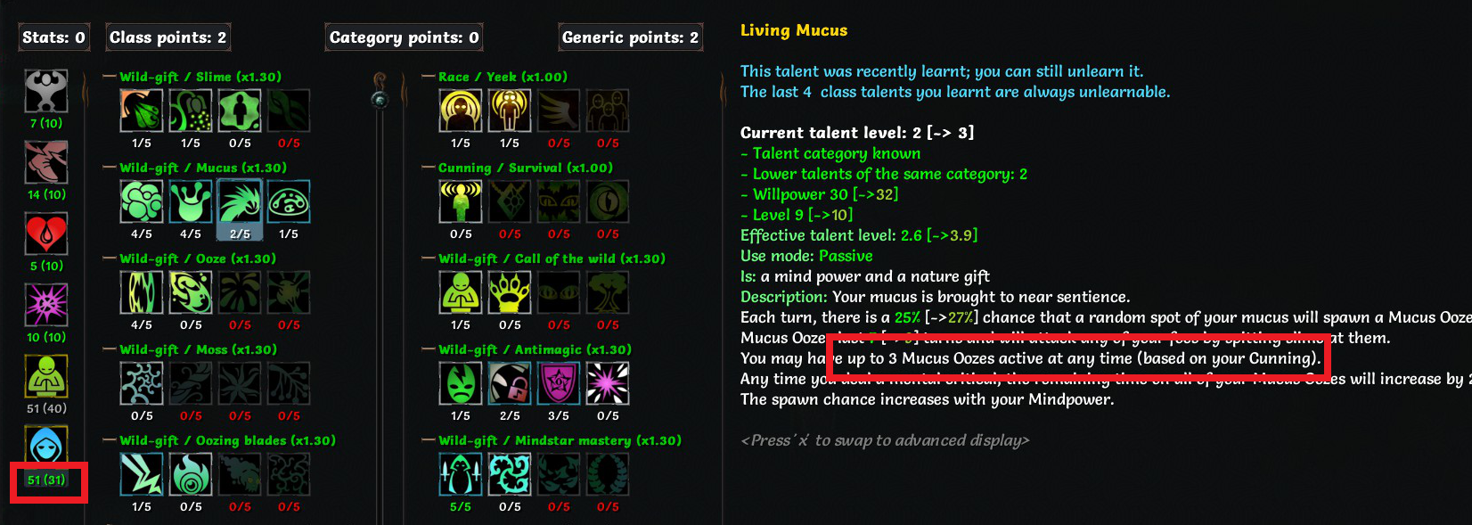 >>50013848 Ты не саммонером играешь, каннинг тебе там даёт максимальное общее колличество суммонов от любых скиллов (ты там всё равно только одного суммона одним скиллом можешь призвать), а не макс число призываемых одним и тем же скиллом. Тут ты смотришь сколько скилл может призывать и формула тут с диминишинг ретёрнами, не линейно растёт число. You may have up to 0.5–5cSS:Cun Mucus Oozes active at any time (based on your Cunning). https://te4.org/wiki/Scaling#cSS Using the function y(x) = m * (t + shift) power + b + add,