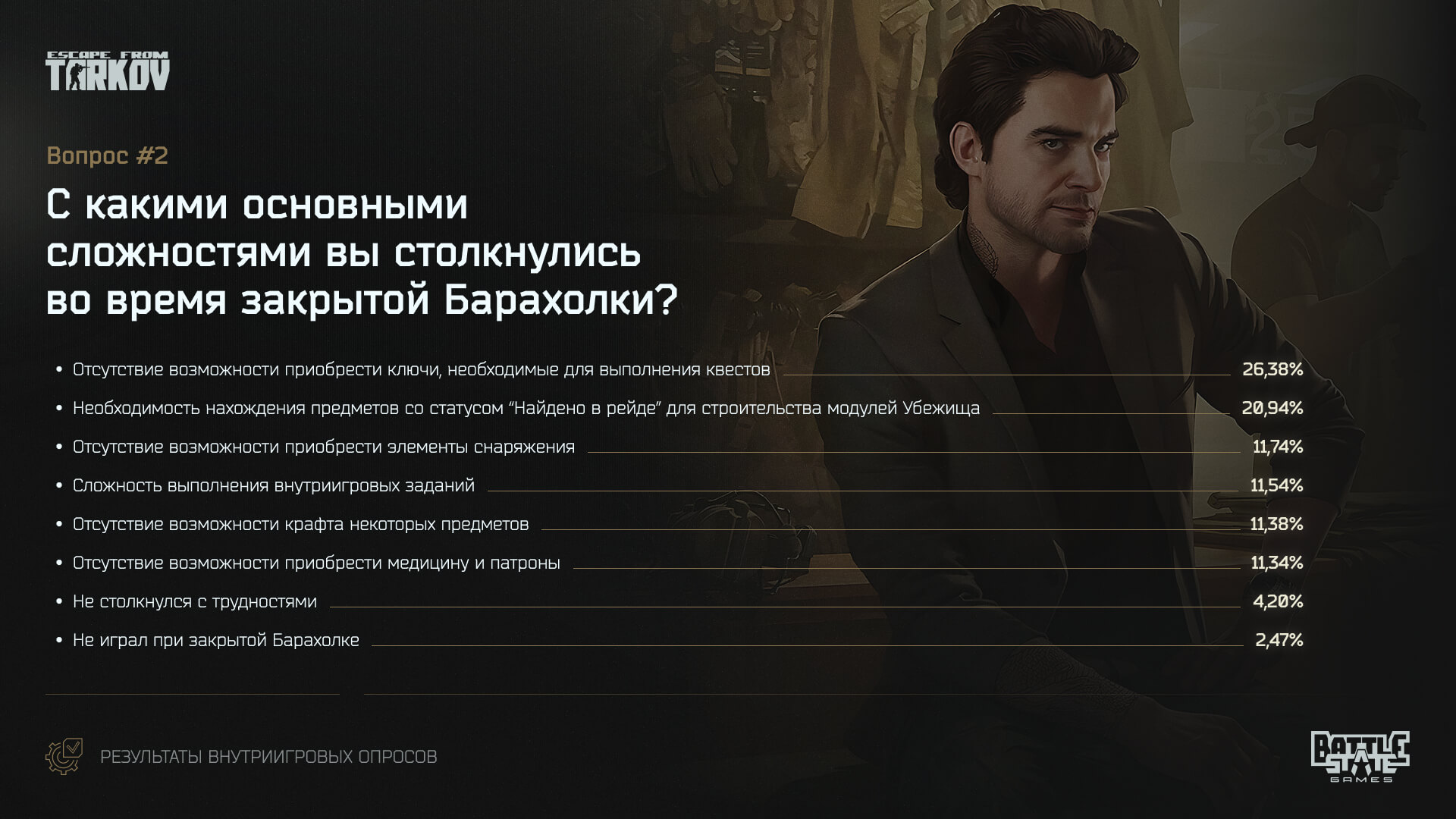 >>50107497 Нет. Был вопрос "Do you find Escape from Tarkov gameplay more engaging with the Flea Market closed?". С ним согласились 48.5%, не 50%. Это не вопрос "нужно ли убрать барахолку из игры". Вопрос про убирание барахолки был, его результаты не опубликовали, потому что проигнорировали.