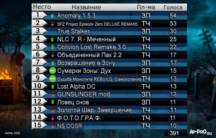 Всего на один голос он обогнал лидера двух предыдущих месяцев, «SFZ Project Episode Zero DELUXE REMAKE». Также стоит отметить, что в ТОП-5 ворвались «NLC 7. Я - Меченный» и «Oblivion Lost Remake 3.0». Июльские новинки «Сумерки Зоны: Дух» и «Судьба Монолита REBUILD: Самокопание» разместились на 8 и 9 строчках, соответственно. А вот еще одному свежеиспечённому короткометражному моду, «Назад в Прошлое», не удалось пробиться в ТОП-15, оставшись на 16 позиции.