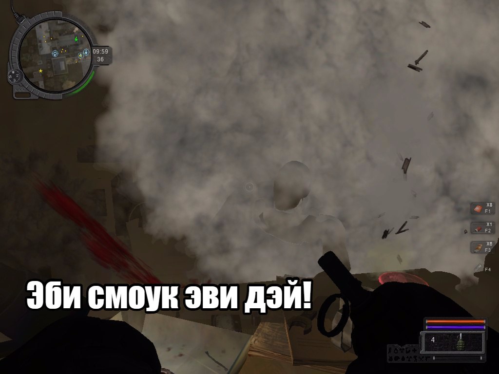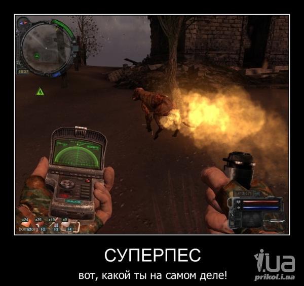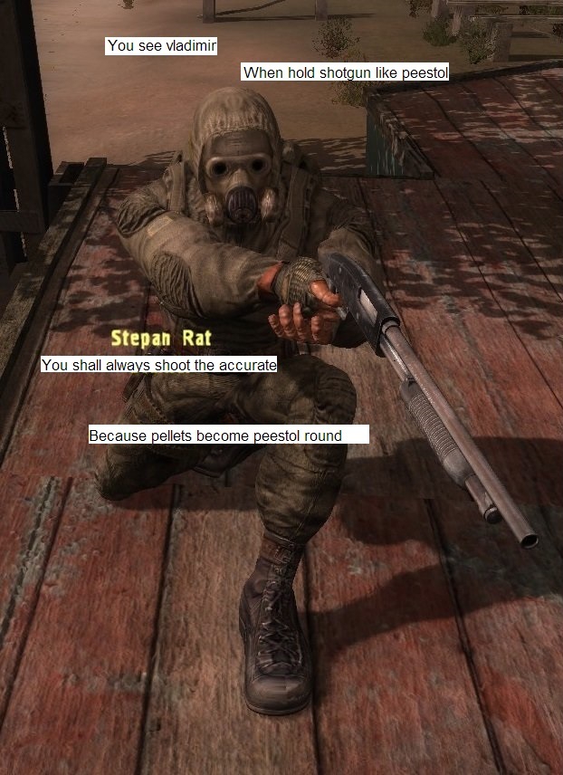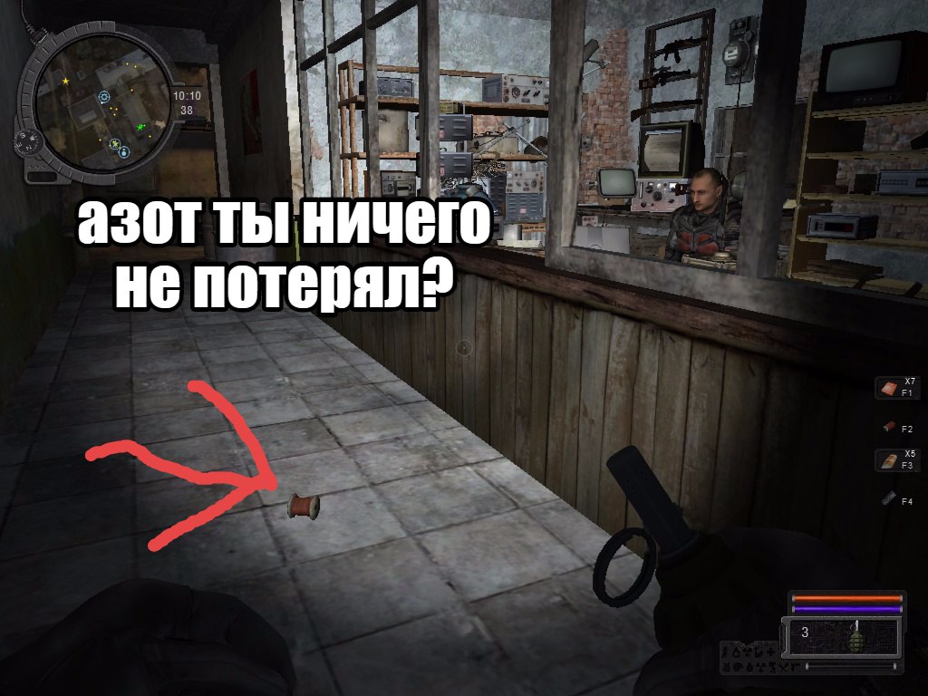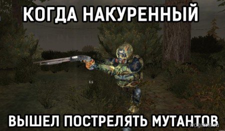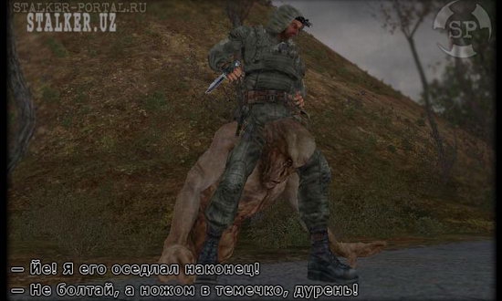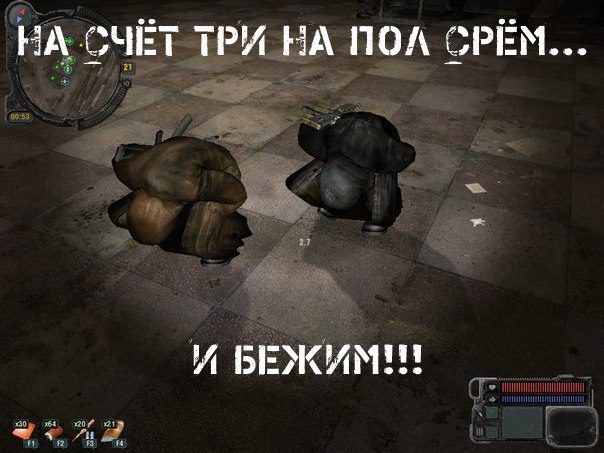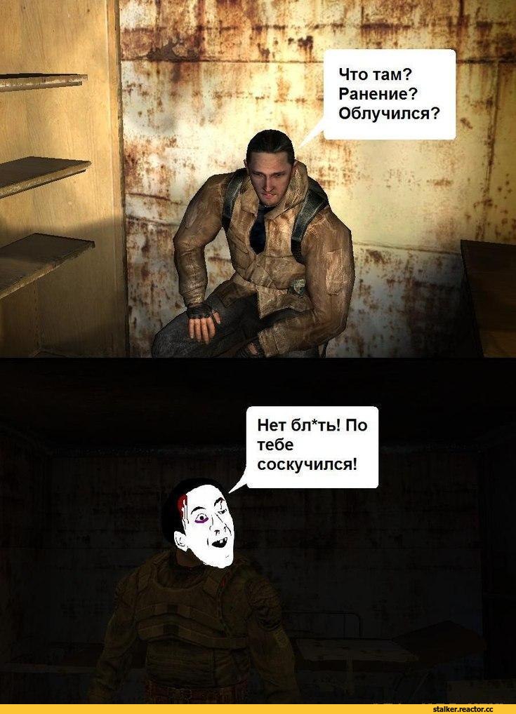 В бар "100 рентген" забегает сталкер и кричит: "все пидоры!" и прыгает под один из столов. Народ загудел, вдруг начинается перестрелка. Лысый стреляет в Гарика, Охотник стреляет в одиночку в коричневом плаще за соседней стойкой. Бармен стреляет в Осведомителя. Пьяный долговец Бром кидает гранату на пол, но по пьяни забывает выдернуть чеку. Перестрелка закончилась, немая сцена, в Баре оседает пыль. В воздухе повисает вопрос: кто в кого зачем стрелял? Лысый: - Да он в подсобку мне пройти не давал! Охотник: - А чё он какой-то странный, приходит в своем плаще и с Валом, и молчит. Бармен: - Да я вообще не знаю, какого хуя он здесь всё время стоит! Тут все сталкеры поворачиваются к Брому и спрашивают: нахуя ты гранату-то на пол кинул? Бром: - Ну-у, э-эта, так сказали ж-ж, что все пидоры!