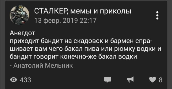 >>50083869 Внимание анекдот! СобралИсь как-то в одном офисе Сяк, Жекан, Ирбис, Пропер, Архара, Стасон, Зендер [вставить остальных], выпили с Григой водки, и запилили "Объеденённый Lost NLC Судьба Шара Солянки Честь Аномали в Апокалипсисе. Завершение"