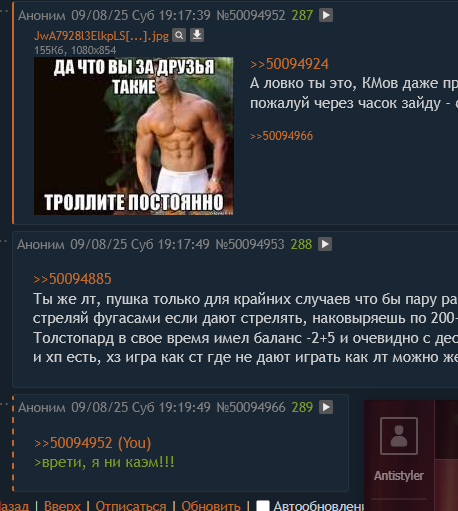 Ктонибудь хоть раз видел как кубаной кидает скрины после боя в тред? за 3 года что я тут сижу ниразу не видел, только скрин его ангара с тигром вроде где он сам сказал что это даже на тот момент был годовой давности.