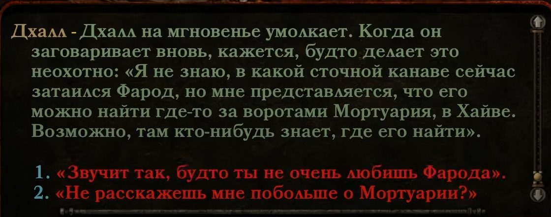 >хоть одну попизделки С каждым вторым персонажем охуенные попизделки в отличие от дискача. В диско элизиуме вывалили в десять раз меньше персонажей, но каждый из них высирает графоманское полотно в десять раз больше, там где это не нужно. Все это выглядит глупо, т.к. тебе какие-то рандомные люди готовы затирать о устройстве мира и прочей хуете, буквально персонажи на уровне лорных книжек из говна вроде ТЕСа. В планескейпе тебе за лор поясняют нормальным образом, допустим там демоны в баре (логично, т.к. в баре пиздеть это нормально), либо какой-нибудь Даккон, поясняя тебе за Круг Зертимона.