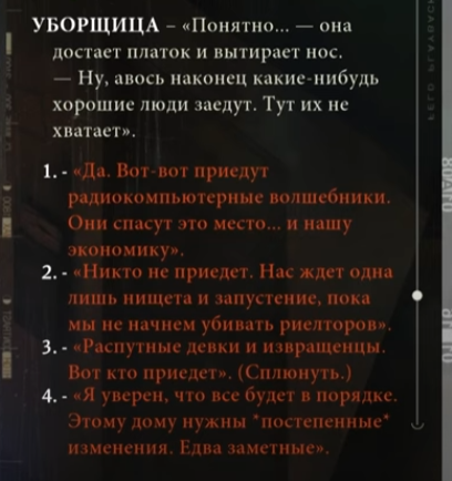 Текст планетки абсолютно мусором перегружен. Диалоги перебиваются какими-то рандомными вставками что чел сделал акцент на какой-то букве, охнул, повернул головой, пукнул. Смотри пик 1 и 2